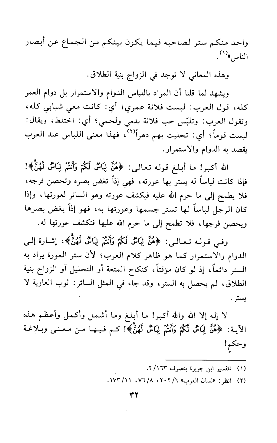 وفي قوله تعالى: {هُنَّ لِبَاسٌ لَكُمْ وَأَنْتُمْ لِبَاسٌ لَهُنَّ}، إشارة إلى الدوام والاستمرار كما هو ظاهر كلام العرب؛ لأن ستر العورة يراد به الستر دائمًا، إذ لو كان مؤقتًا، كنكاح المتعة أو التحليل أو الزواج بنية الطلاق، لم يحصل به الستر، وقد جاء في المثل السائر: ثوب العارية لا يستر.