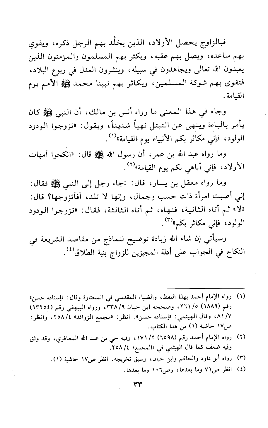 وجاء في هذا المعنى ما رواه أنس بن مالك، أن النبي - صلى الله عليه وسلم - كان يأمر بالباءة وينهى عن التبتل نهيًا شديدًا، ويقول: «تزوجوا الودود الولود، فإني مكاثر بكم الأنبياء يوم القيامة» (¬1).
