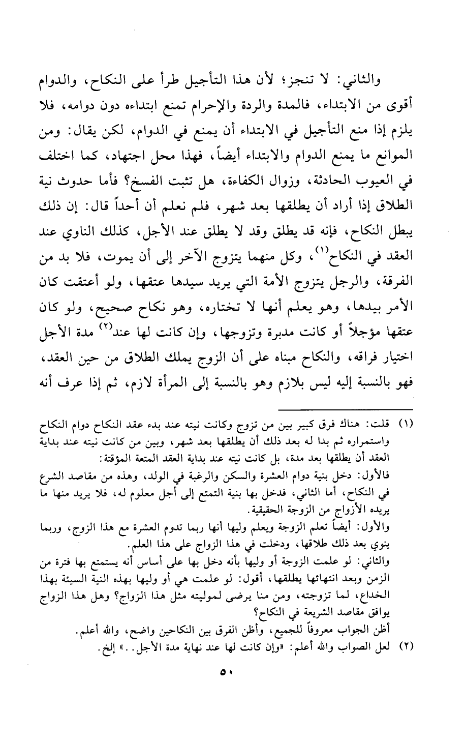 (¬1) قلت: هناك فرق كبير بين من تزوج وكانت نيته عند بدء عقد النكاح دوام النكاح واستمراره ثم بدا له بعد ذلك أن يطلقها بعد شهر، وبين من كانت نيته عند بداية العقد أن يطلقها بعد مدة، بل كانت نيته عند بداية العقد المتعة المؤقتة: