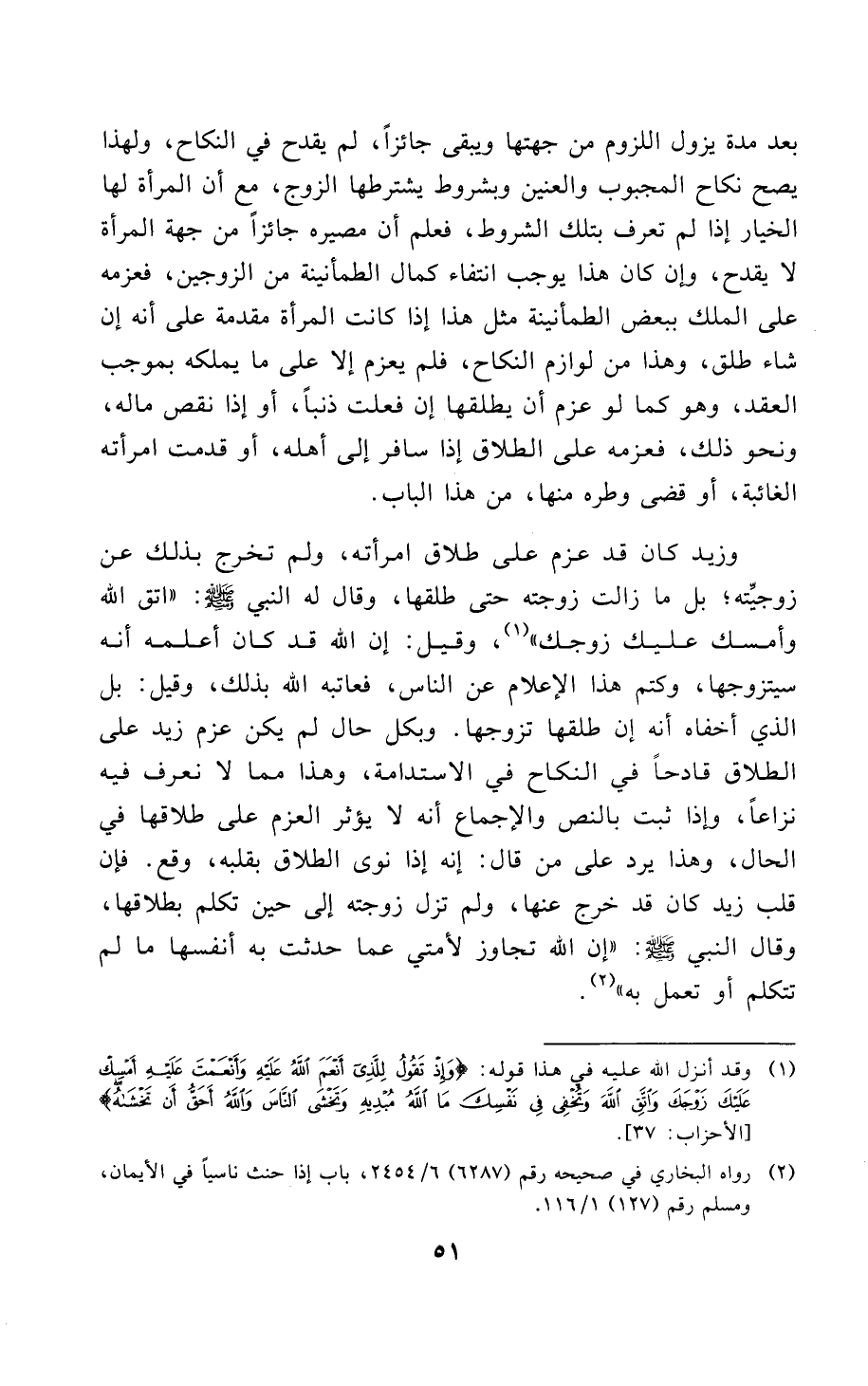 وزيد كان قد عزم على طلاق امرأته، ولم تخرج بذلك عن زوجيَّته؛ بل ما زالت زوجته حتى طلقها، وقال له النبي - صلى الله عليه وسلم -: «اتق الله وأمسك عليك زوجك» (¬1)، وقيل: إن الله قد كان أعلمه أن سيتزوجها، وكتم هذا الإعلام عن الناس، فعاتبه الله بذلك، وقيل: بل الذي أخفاه أنه إن طلقها تزوجها. وبكل حال لم يكن عزم زيد على الطلاق قادحًا في النكاح في الاستدامة، وهذا مما لا نعرف فيه نزاعًا، وإذا ثبت بالنص والإجماع أنه لا يؤثر العزم على طلاقها في الحال، وهذا يرد على من قال: إنه إذا نوى الطلاق بقلبه، وقع. فإن قلب زيد كان قد خرج عنها، ولم تزل زوجته إلى حين تكلم بطلاقها، وقال النبي - صلى الله عليه وسلم -: «إن الله تجاوز لأمتي عما حدثت به أنفسها ما لم تتكلم أو تعمل به» (¬2).