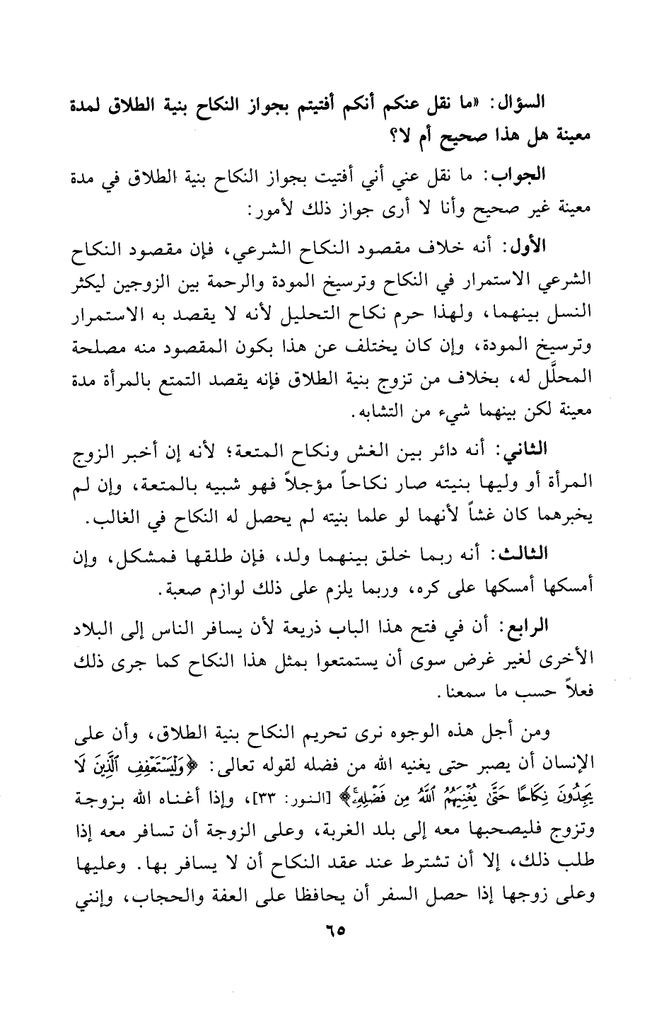 السؤال: «ما نقل عنكم أنكم أفتيتم بجواز النكاح بنية الطلاق لمدة معينة هل هذا صحيح أم لا؟».