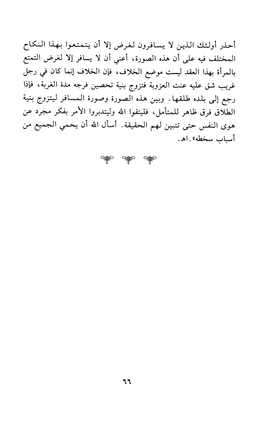 أحذر أولئك الذين لا يسافرون لغرض إلا أن يتمتعوا بهذا النكاح المختلف فيه على أن هذه الصورة، أعني أن لا يسافر إلا لغرض التمتع بالمرأة بهذا العقد ليست موضع الخلاف، فإن الخلاف إنما كان في رجل غريب شق عليه عنت العزوبة فتزوج بنية تحصين فرجه مدة الغربة، فإذا رجع إلى بلده طلقها. وبين هذه الصورة وصورة المسافر ليتزوج بنية الطلاق فرق ظاهر للمتأمل، فليتقوا الله وليتدبروا الأمر بفكر مجرد عن هوى النفس حتى تتبين لهم الحقيقة. أسأل الله أن يحمي الجميع من أسباب سخطه. أ. هـ.