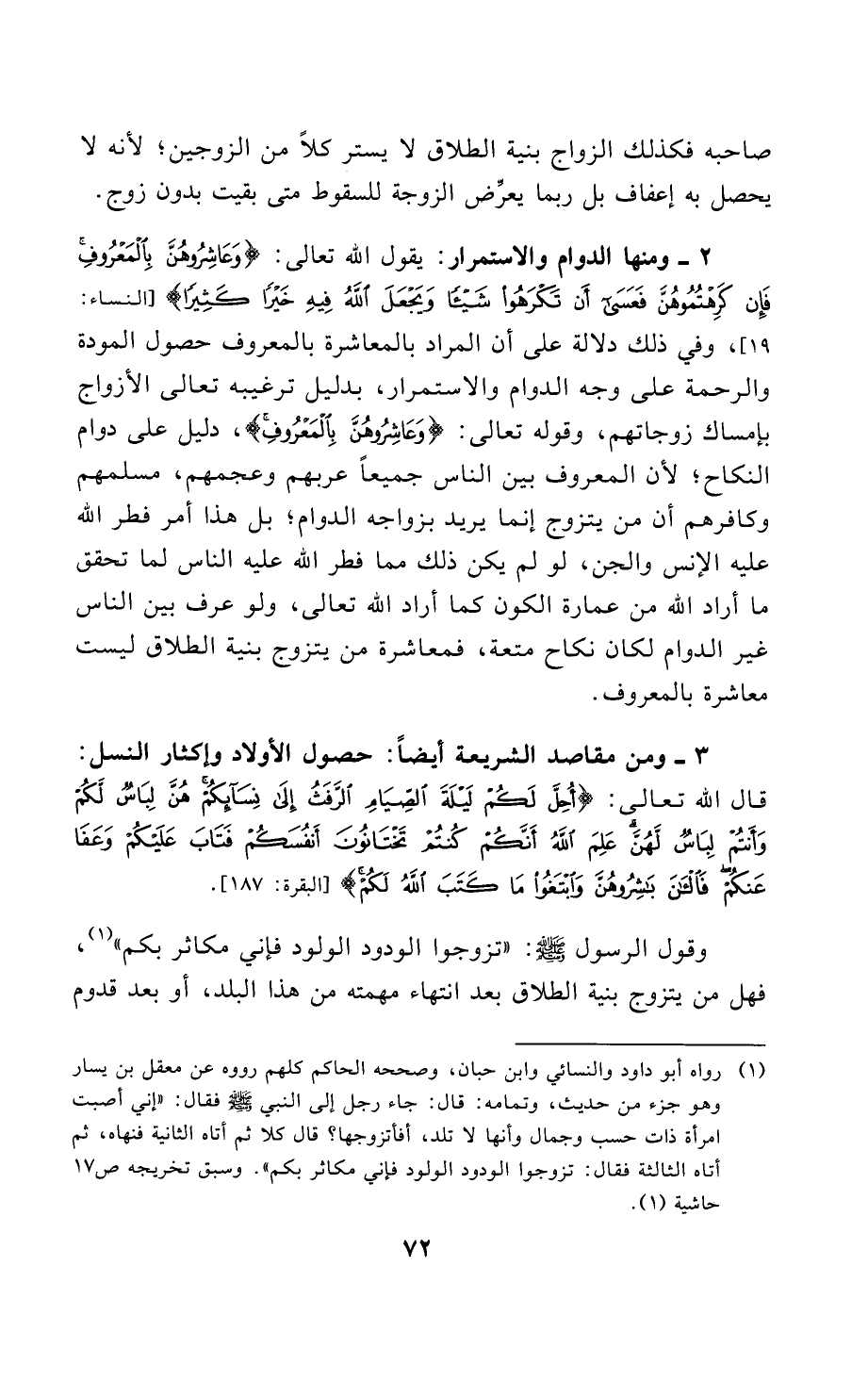 3 - ومن مقاصد الشريعة أيضًا: حصول الأولاد وإكثار النسل: قال الله تعالى: {أُحِلَّ لَكُمْ لَيْلَةَ الصِّيَامِ الرَّفَثُ إِلَى نِسَائِكُمْ هُنَّ لِبَاسٌ لَكُمْ وَأَنْتُمْ لِبَاسٌ لَهُنَّ عَلِمَ اللَّهُ أَنَّكُمْ كُنْتُمْ تَخْتَانُونَ أَنْفُسَكُمْ فَتَابَ عَلَيْكُمْ وَعَفَا عَنْكُمْ فَالْآَنَ بَاشِرُوهُنَّ وَابْتَغُوا مَا كَتَبَ اللَّهُ لَكُمْ} [البقرة: 187].