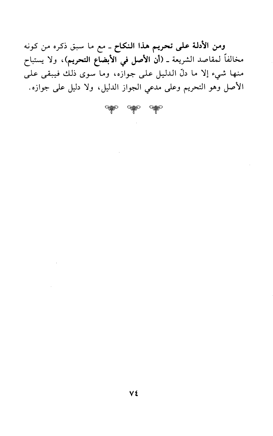 ومن الأدلة على تحريم هذا النكاح - مع ما سبق ذكره من كونه مخالفًا لمقاصد الشريعة - (أن الأصل في الأبضاع التحريم)، ولا يستباح منها شيء إلا ما دلّ الدليل على جوازه، وما سوى ذلك فيبقى على الأصل وهو التحريم وعلى مدعي الجواز الدليل، ولا دليل على جوازه.