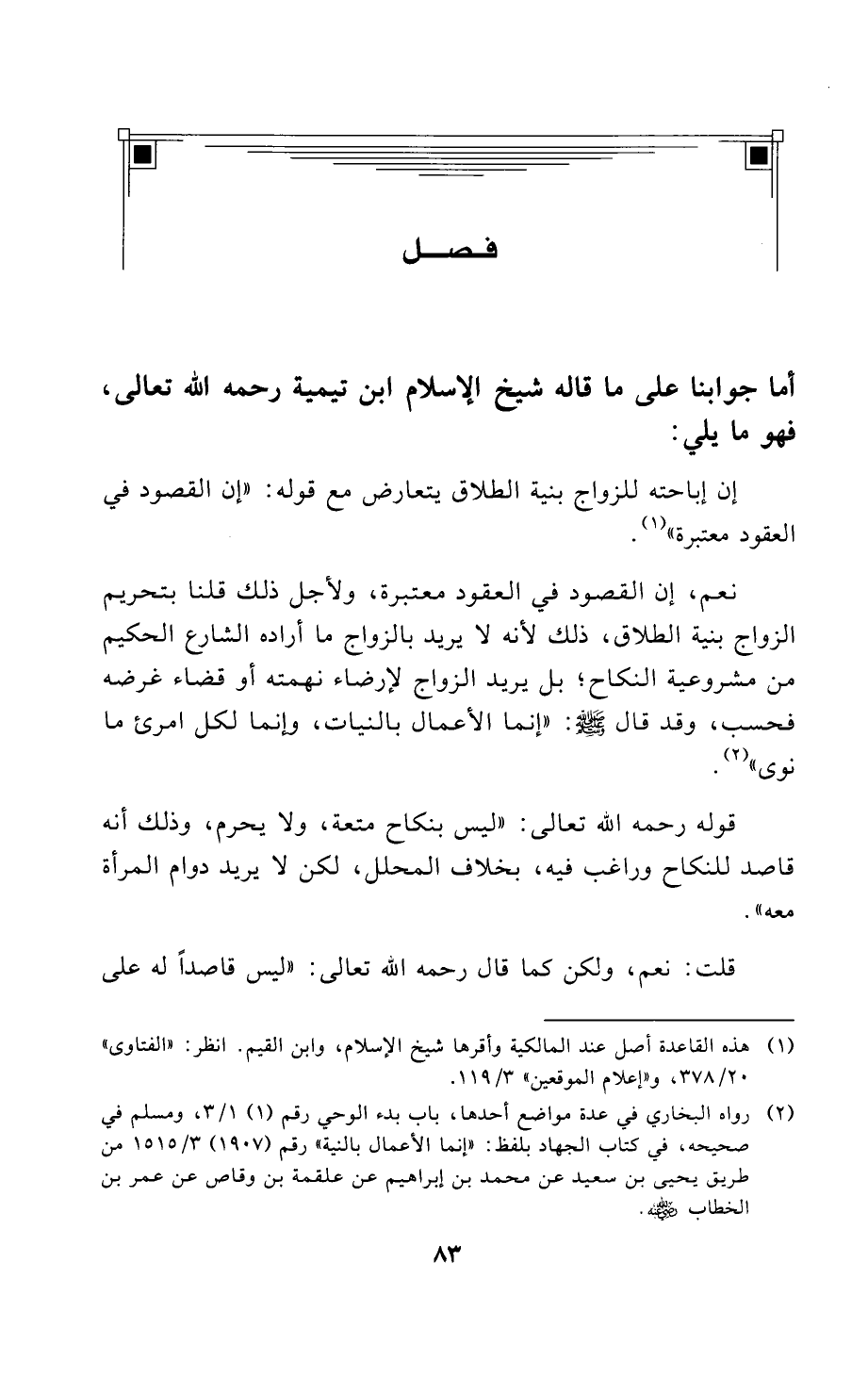 نعم إن القصود في العقود معتبرة، ولأجل ذلك قلنا بتحريم الزواج بنية الطلاق، ذلك لأنه لا يريد بالزواج ما أراده الشارع الحكيم من مشروعية النكاح؛ بل يريد الزواج لإرضاء نهمته أو قضاء غرضه فحسب، وقد قال - صلى الله عليه وسلم -: «إنما الأعمال بالنيات، وإنما لكل امرئ ما نوى» (¬2).
