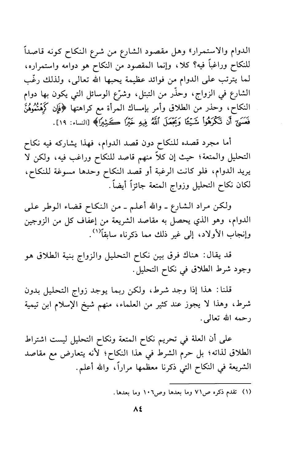 على أن العلة في تحريم نكاح المتعة ونكاح التحليل ليست اشتراط الطلاق لذاته؛ بل حرم الشرط في هذا النكاح؛ لأنه يتعارض مع مقاصد الشريعة في النكاح التي ذكرنا معظمها مرارًا، والله أعلم.