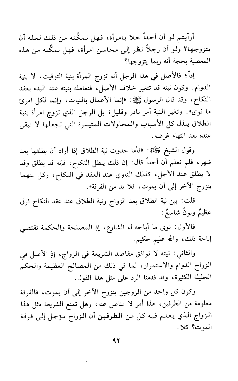 إذًا؛ فالأصل في هذا الرجل أنه تزوج المرأة بنية التوقيت، لا بنية الدوام. وكون نيته قد تتغير خلاف الأصل، فنعامله بنيته عند البدء بعقد النكاح، وقد قال الرسول - صلى الله عليه وسلم -: «إنما الأعمال بالنيات، وإنما لكل امرئ ما نوى». وتغير النية أمر نادر وقليل؛ بل الرجل الذي تزوج امرأة بنية الطلاق يبذل كل الأسباب والمحاولات المتيسرة التي تجعلها لا تبقى عنده بعد انتهاء غرضه.