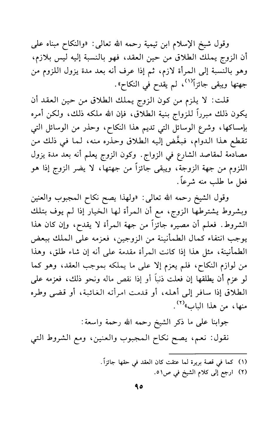 وقول الشيخ رحمه الله تعالى: «ولهذا يصح نكاح المجبوب والعنين وبشروط يشترطها الزوج، مع أن المرأة لها الخيار إذا لم يوف بتلك الشروط. فعلم أن مصيره جائزًا من جهة المرأة لا يقدح، وإن كان هذا يوجب انتفاء كمال الطمأنينة من الزوجين، فعزمه على الملك ببعض الطمأنينة، مثل هذا إذا كانت المرأة مقدمة على أنه إن شاء طلق، وهذا من لوازم النكاح، فلم يعزم إلا على ما يملكه بموجب العقد، وهو كما لو عزم أن يطلقها إن فعلت ذنبًا أو إذا نقص ماله ونحو ذلك، فعزمه على الطلاق إذا سافر إلى أهله، أو قدمت امرأته الغائبة، أو قضى وطره منها، من هذا الباب» (¬2).