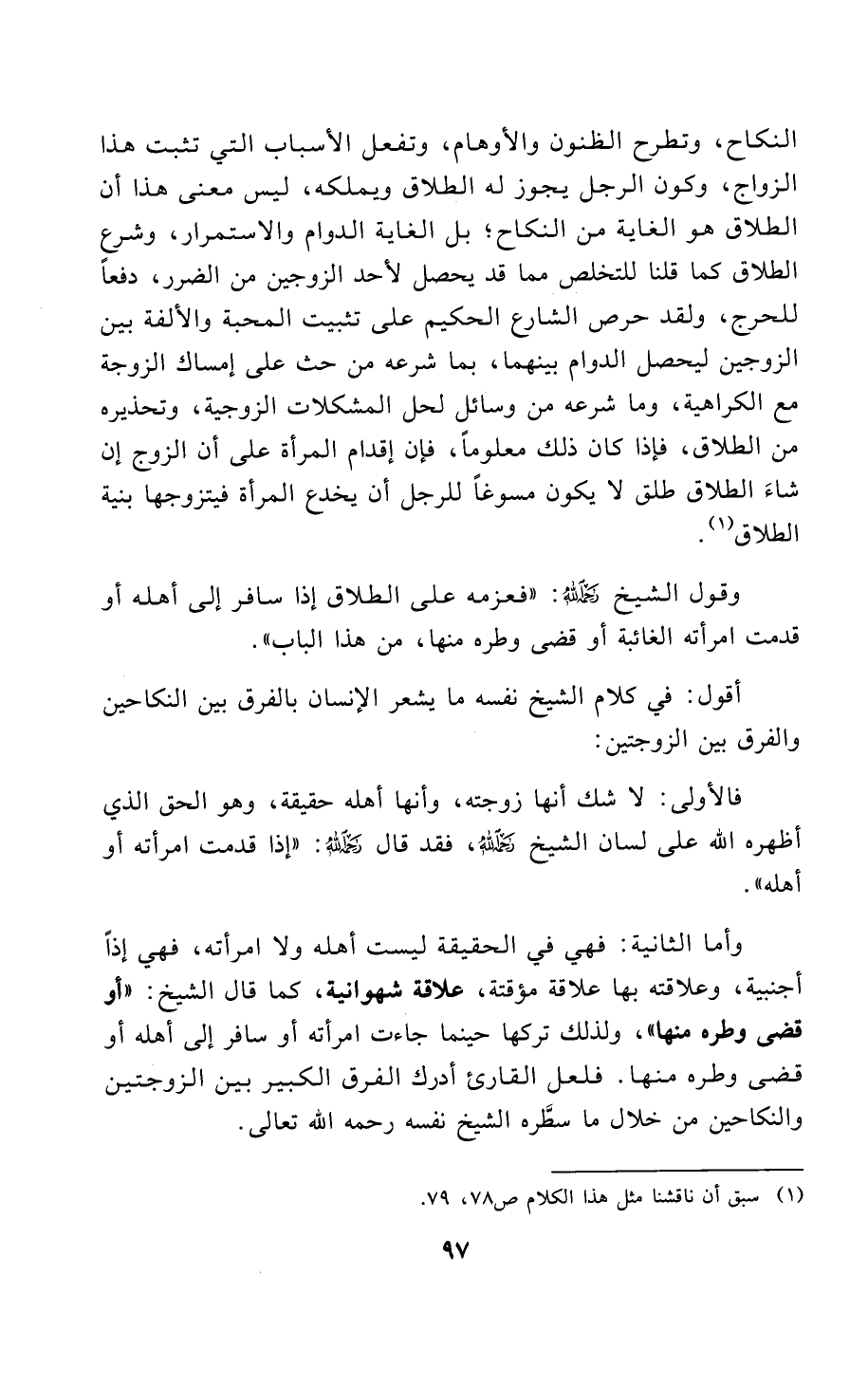 وأما الثانية: فهي في الحقيقة ليست أهله ولا امرأته، فهي إذًا أجنبية، وعلاقته بها علاقة مؤقتة، علاقة شهوانية، كما قال الشيخ: «أو قضى وطره منها»، ولذلك تركها حينما جاءت امرأته أو سافر إلى أهله أو قضى وطره منها. فلعل القارئ أدرك الفرق الكبير بين الزوجتين والنكاحين من خلال ما سطَّره الشيخ نفسه رحمه الله تعالى.