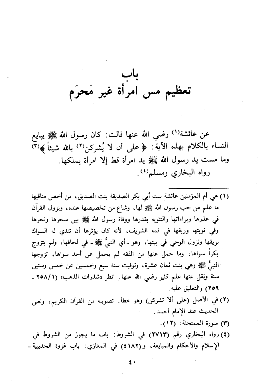 عن عائشة رضي الله عنها قالت: كان رسول الله صَلَّى اللهُ عَلَيْهِ وَسَلَّمَ يبايع النساء بالكلام بهذه الآية: (عَلى أن لا يُشرِكن بِاللهِ شَيئاً) وما مست يد رسول الله صَلَّى اللهُ عَلَيْهِ وَسَلَّمَ يد امرأة قط إلا امرأة يملكها.