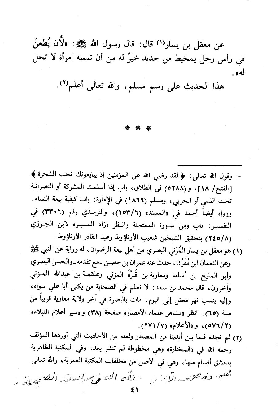 عن معقل بن يسار قال: قال رسول الله صَلَّى اللهُ عَلَيْهِ وَسَلَّمَ: (لأن يطعن في رأس رجل بمخيط من حديد خير له من أن تمسه امرأة لا تحل له) .