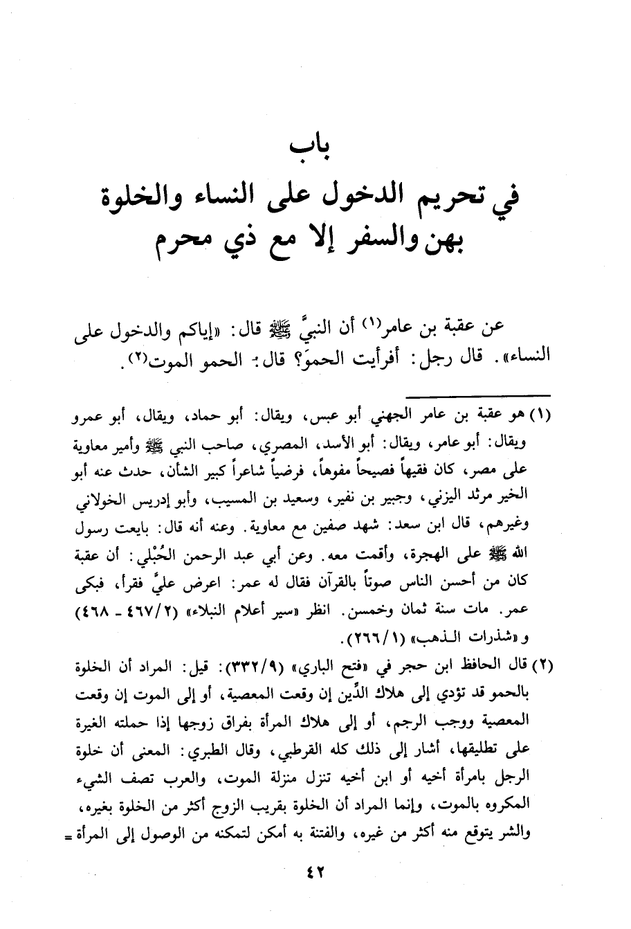 عن عقبة بن عامر أن النبي صَلَّى اللهُ عَلَيْهِ وَسَلَّمَ قال: (إياكم والدخول على النساء) . قال رجل: أفرأيت الحمو؟ قال: الحمو الموت.