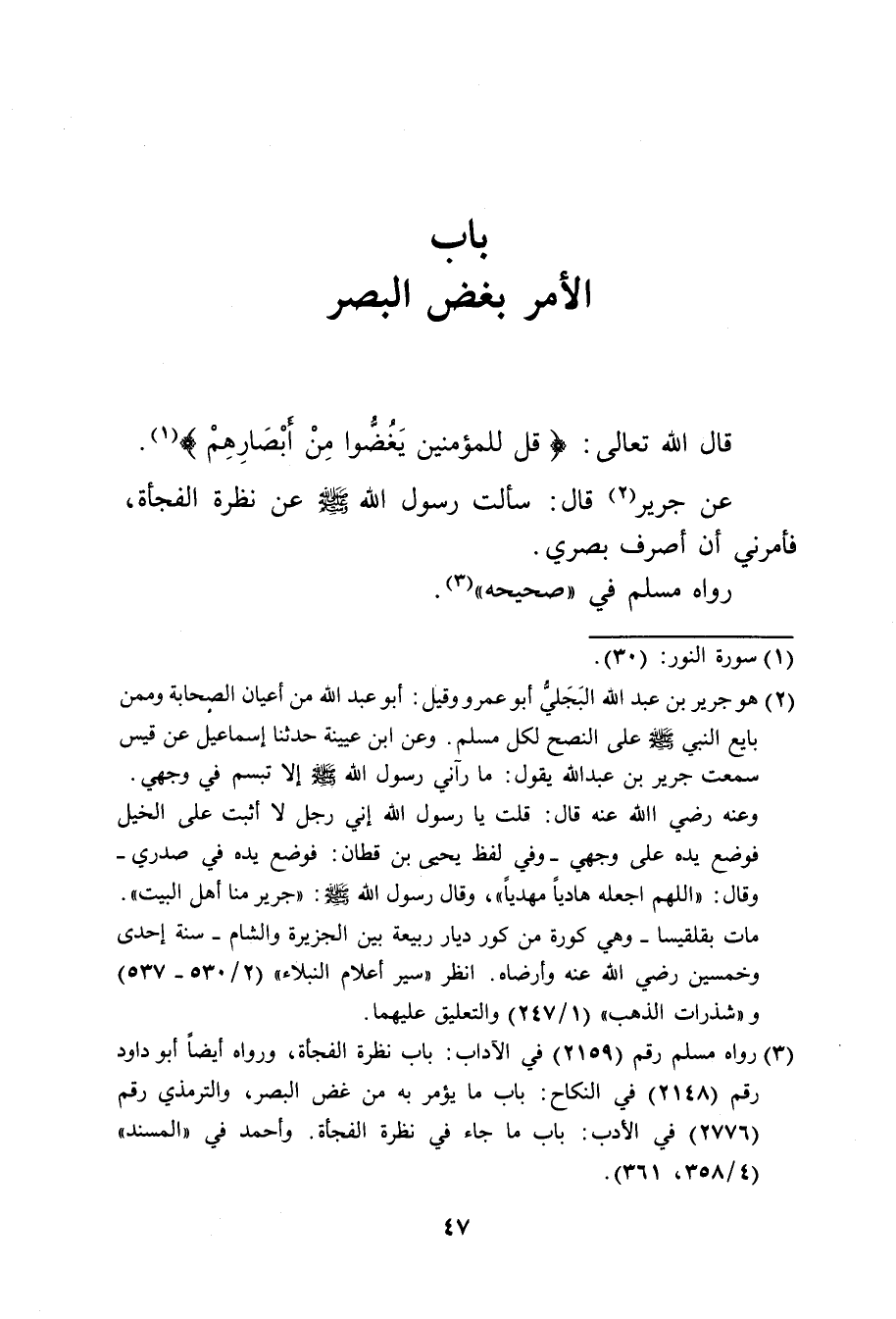 عن جرير قال: سألت رسول الله صَلَّى اللهُ عَلَيْهِ وَسَلَّمَ عن نظرة الفجأة، فأمرني أن أصرف بصري.