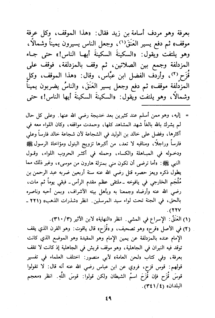 بعرفة وهو مردف أسامة بن زيد فقال: (هذا الموقف، وكل عرفة موقف) ثم دفع يسير العنق، وجعل الناس يسيرون يميناً وشمالاً، وهو يلتفت ويقول: (السكينة السكنية أيها الناس!) حتى