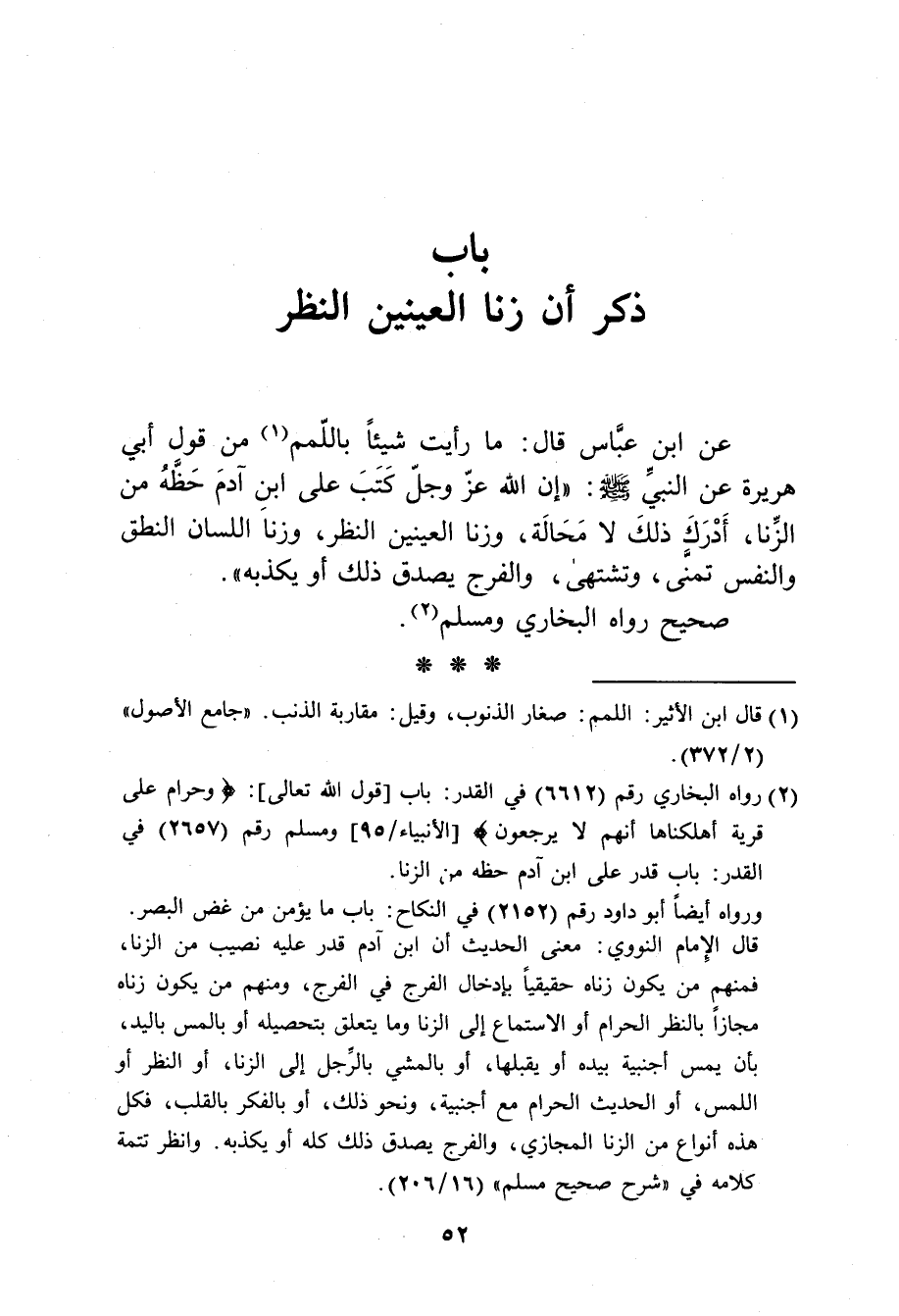 عن ابن عباس قال: ما رأيت شيئاً باللمم من قول أبي هريرة عن النبي صَلَّى اللهُ عَلَيْهِ وَسَلَّمَ: (إن الله عز وجل كتب على ابن آدم حظه من الزنا، أدرك ذلك لا محالة، وزنا العينين النظر، وزنا اللسان النطق والنفس تمنى، وتشتهى، والفرج يصدق ذلك أو يكذبه) .