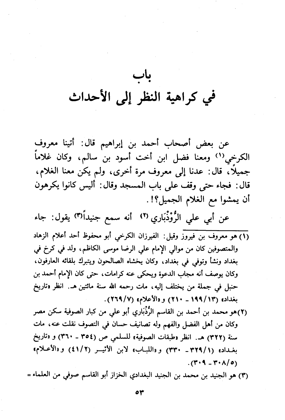 عن بعض أصحاب أحمد بن إبراهيم قال: أتينا معروف الكرخي ومعنا فضل بن أخت أسود بن سالم، وكان غلاماً جميلاً، قال: عدنا إلى معروف مرة أخرى، ولم يكن معنا الغلام، قال: فجاء حتى وقف على باب المسجد وقال: أليس كانوا يكرهون أن يمشوا مع الغلام الجميل؟!.