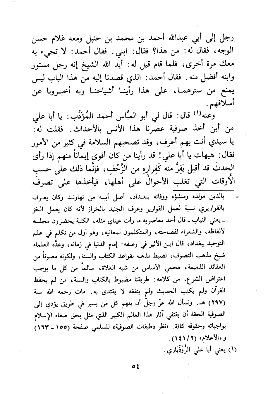 رجل إلى أبي عبد الله بن محمد بن حنبل ومعه غلام حسن الوجه، فقال له: من هذا؟ فقال: ابني. فقال أحمد: لا تجيء به معك مرة أخرى، فلما قام قيل له: أيد الله الشيخ إنه رجل مستور وابنه أفضل منه. فقال أحمد: الذي قصدنا إليه من هذا الباب ليس يمنع من سترهما، على هذا رأينا أشياخنا وبه أخبرونا عن أسلافهم.