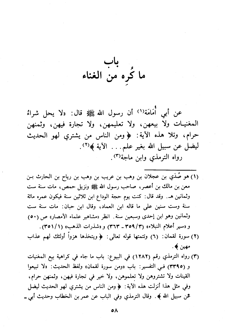عن أبي أمامة أن رسول الله صَلَّى اللهُ عَلَيْهِ وَسَلَّمَ قال: (لا يحل شراء المغنيات ولا بيعهن، ولا تعليمهن، ولا تجارة فيهن، وثمنهن حرام، وتلا هذه الآية: (ومِن النَاسِ مَن يشتري لهو الحَدِيثِ ليضُل عن سَبيلِ اللهِ بِغيرِ عِلم ... الآية) .