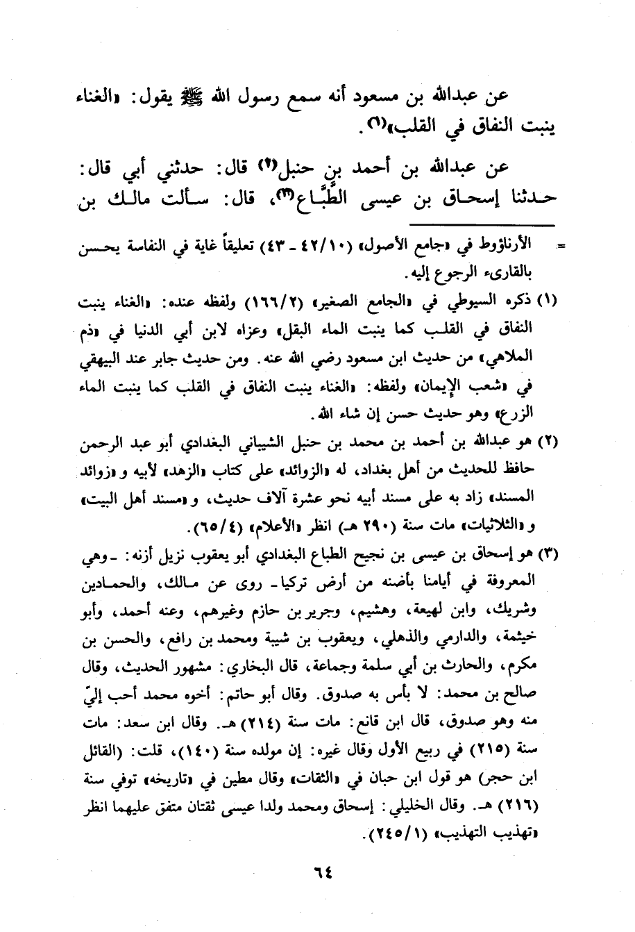 عن عبد الله بن مسعود أنه سمع رسول الله صَلَّى اللهُ عَلَيْهِ وَسَلَّمَ يقول: (الغناء ينبت النفاق في القلب) .