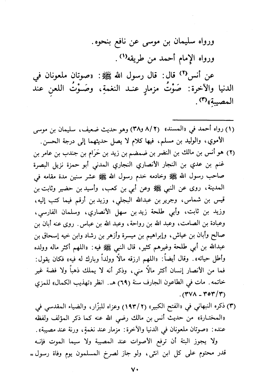 عن أنس قال: قال رسول الله صَلَّى اللهُ عَلَيْهِ وَسَلَّمَ: (صوتان ملعونان في الدنيا والآخرة: صوت مزمارٍ عند النغمة، وصوت اللعن عند المصيبة) .