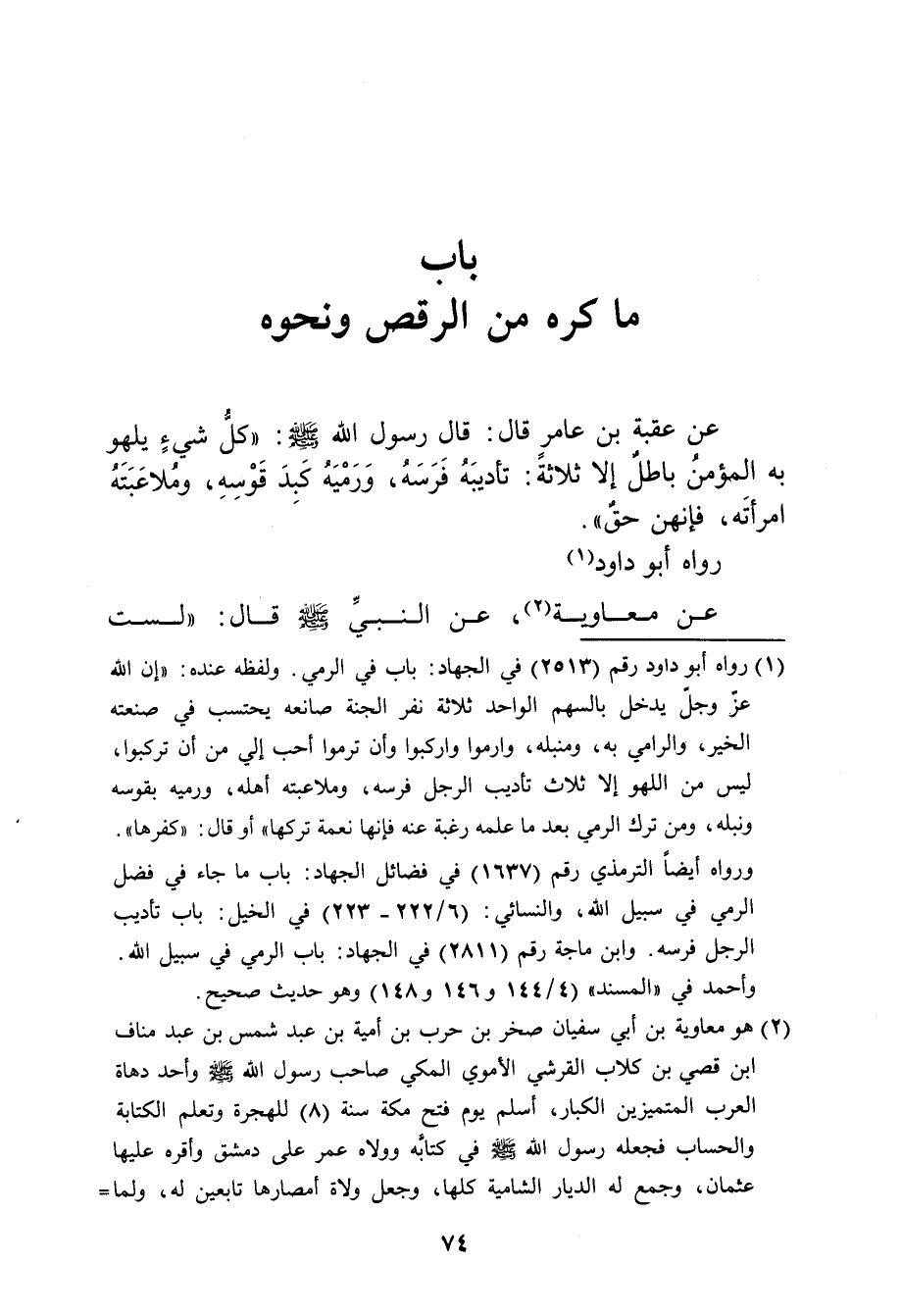 عن عقبة بن عامر قال: قال رسول الله صَلَّى اللهُ عَلَيْهِ وَسَلَّمَ: (كل شيءٍ يلهو به المؤمن باطل إلا ثلاثةً: تأديبه فرسه، ورميه كبد قوسه، وملاعبته امرأته، فإنهن حق) .