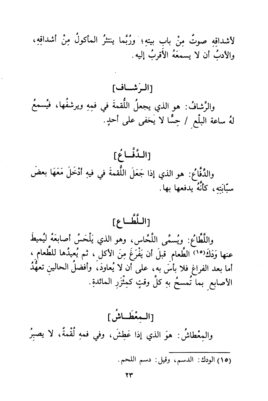 لأشداقه صوت من باب بيته؛ وربما ينتثر المأكول من أشداقه، والأدب أن لا يسمعه الأقرب إليه.