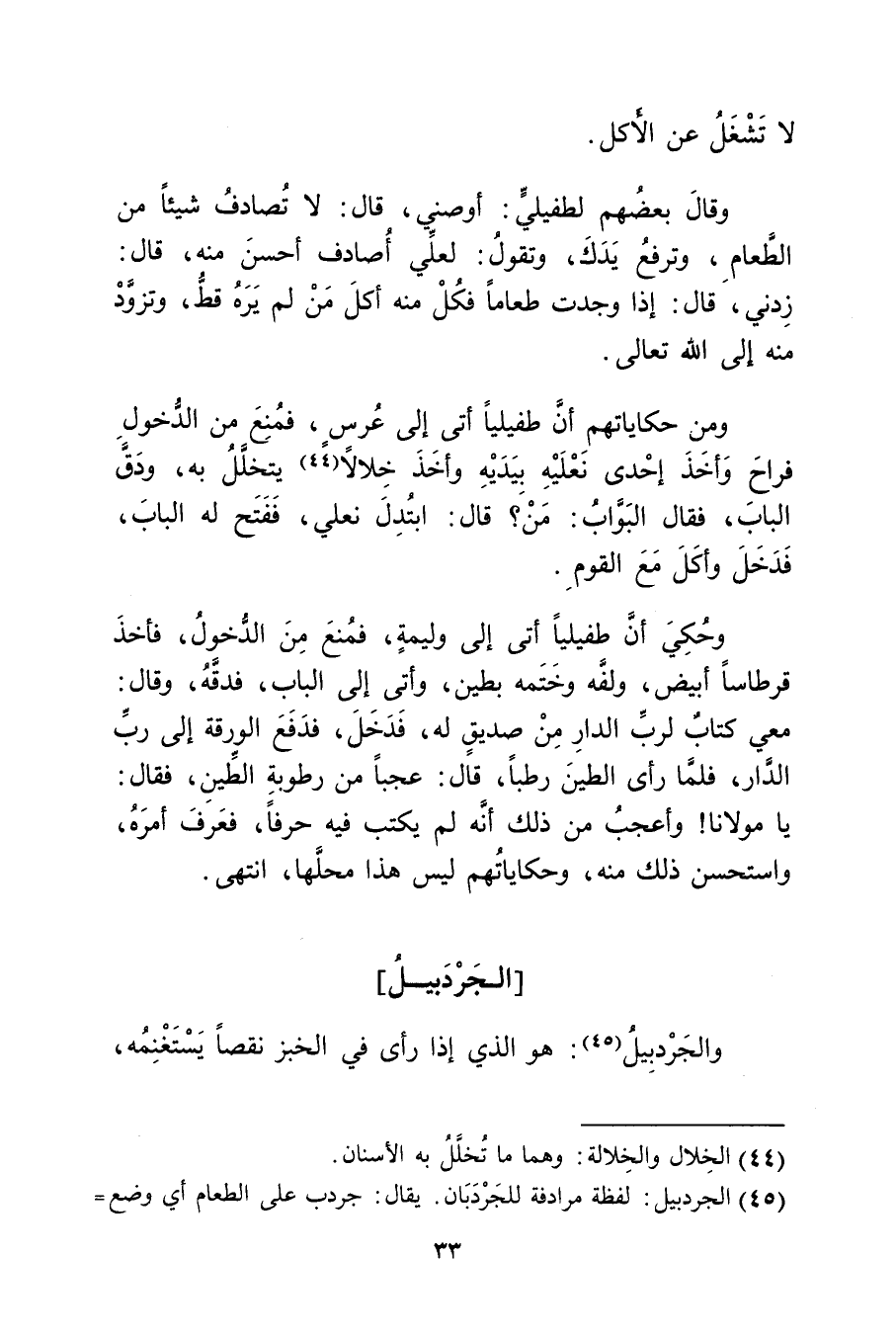 وحكي أن طفيلياً أتى إلى وليمةٍ، فمنع من الدخول، فأخذ قرطاساً أبيض، ولفه وختمه بطين، وأتى إلى الباب، فدقه، وقال: معي كتاب لرب الدار من صديق له، فدخل، فدفع الورقة إلى رب الدار، فلما رأى الطين رطباً، قال: عجباً من رطوبة الطين، فقال: يا مولانا! وأعجب من ذلك أنه لم يكتب فيه حرفاً، فعرف أمره، واستحسن ذلك منه، وحكاياتهم ليس هذا محلها، انتهى.