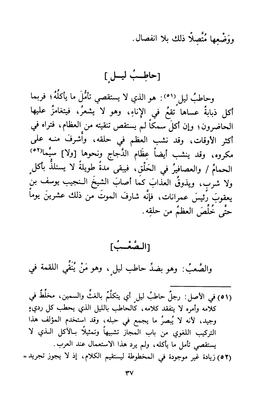 وحاطب ليلٍ: هو الذي لا يستقصي تأمل ما يأكله؛ فربما أكل ذبابةً عساها تقع في الإناء، وهو لا يشعر، فيتغامز عليها الحاضرون؛ وإن أكل سمكاً لم يستقص تنقيته من العظام، فتراه في أكثر الأوقات، وقد نشب العظم في حلقه، وأشرف منه على مكروه، وقد ينشب أيضاً عظام الدجاج ونحوها ولا سيما الحمام والعصافير في الحلق، فيبقى مدة طويلة لا يستلذ بأكل ولا شرب، ويذوق العذاب كما أصاب الشيخ النجيب يوسف بن يعقوب رئيس عمرانات، فإنه شارف الموت من ذلك عشرين يوماً حتى خلص العظم من حلقه.