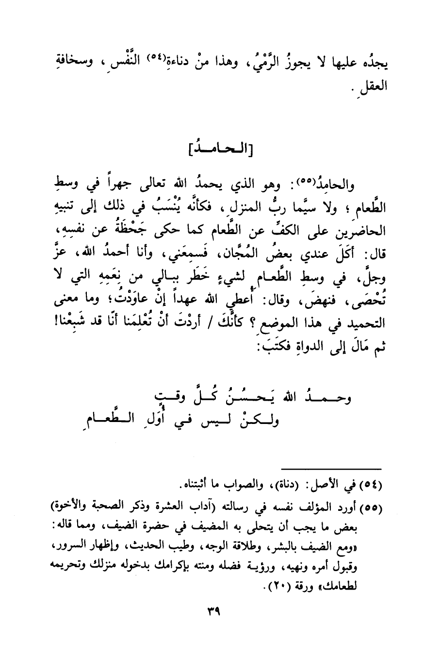 والحامد: وهو الذي يحمد الله تعالى جهراً في وسط الطعام؛ ولا سيما رب المنزل، فكأنه ينسب في ذلك إلى تنبيه الحاضرين على الكف عن الطعام كما حكى جحظة عن نفسه، قال: أكل عندي بعض المجان، فسمعني، وأنا أحمد الله، عز وجل، في وسط الطعام لشيءٍ خطر ببالي من نعمه التي لا تحصى، فنهض، وقال: أعطي الله عهداً إن عاودت؛ وما معنى التحميد في هذا الموضع؟ كأنك أردت أن تعلمنا أنا قد شبعنا! ثم مال إلى الدواة فكتب: