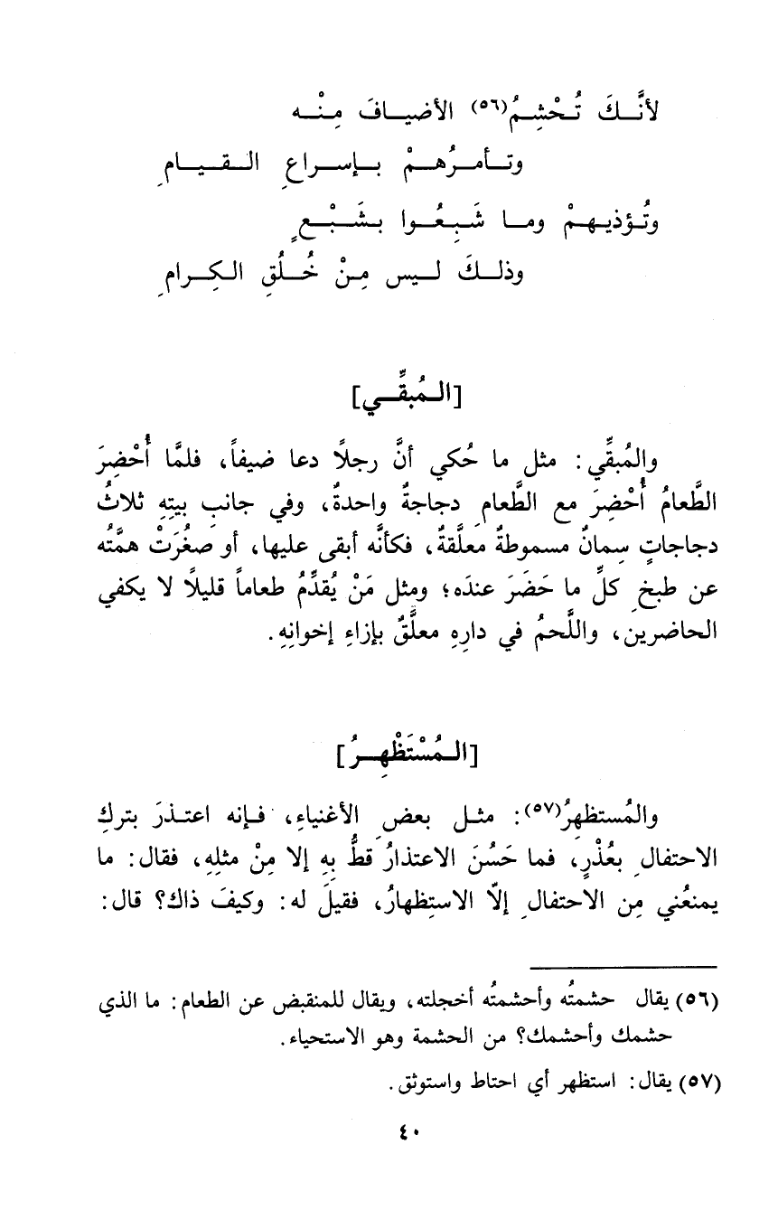 والمبقي: مثل ما حكي أن رجلاً دعا ضيفاً، فلما أحضر الطعام أحضر مع الطعام دجاجةٌ واحدةٌ، وفي جانب بيته ثلاث دجاجات سمان مسموطة معلقة، فكأنه أبقى عليها، أو صغرت همته عن طبخ كل ما حضر عنده؛ ومثل من يقدم طعاماً قليلاً لا يكفي الحاضرين، واللحم في داره معلق بإزاء إخوانه.