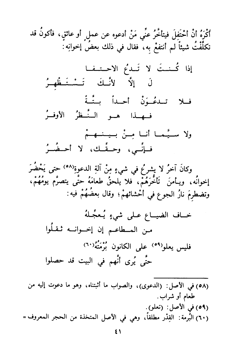 أكره أن أحتفل فيتأخر عني من أدعوه عن عملٍ أو عائقٍ، فأكون قد تكلفت شيئاً لم أنتفع به، فقال في ذلك بعض إخوانه: