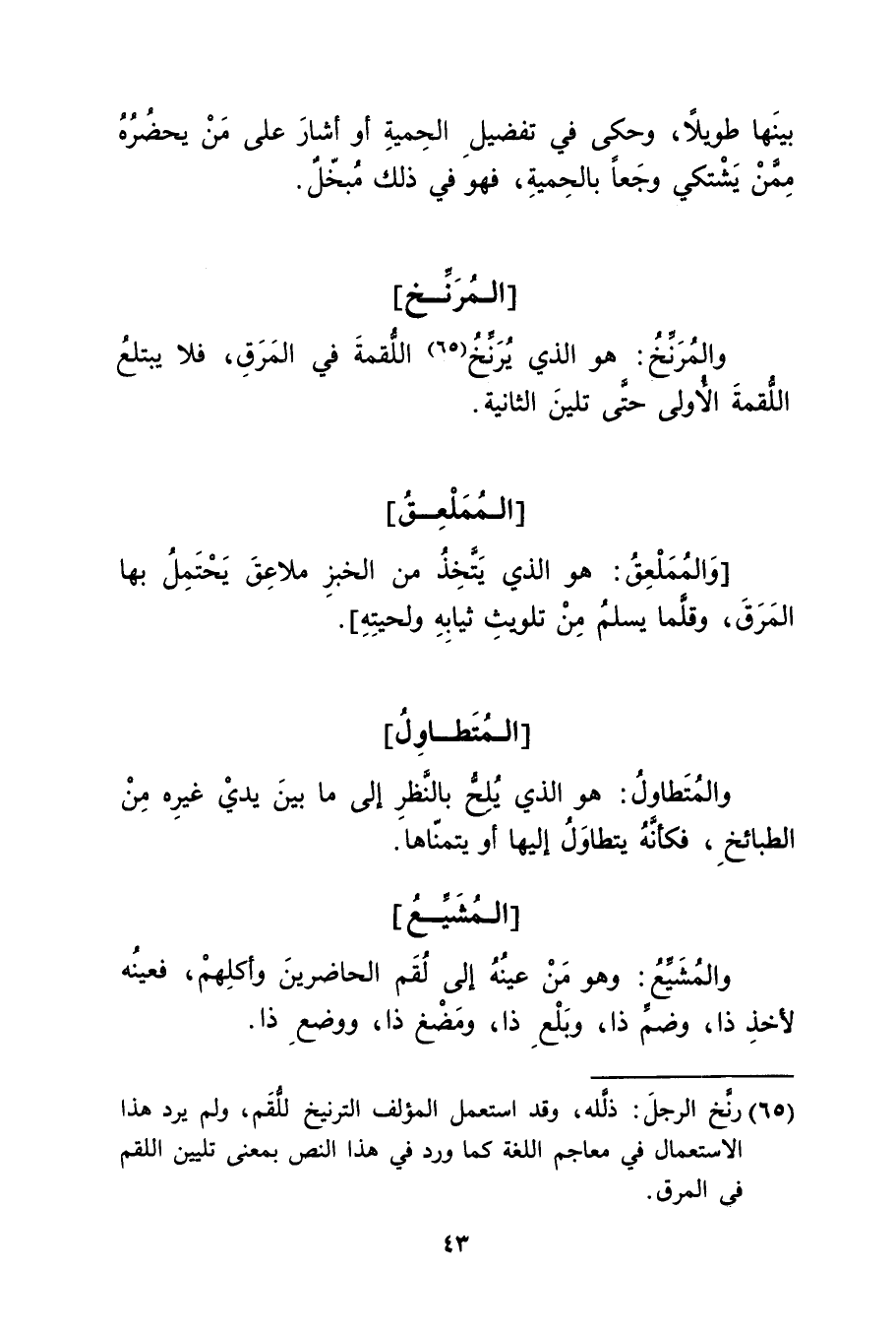 والمشيع: وهو من عينه إلى لقم الحاضرين وأكلهم، فعينه لأخذ ذا، وضم ذا، وبلع ذا، ومضغ ذا، ووضع ذا.