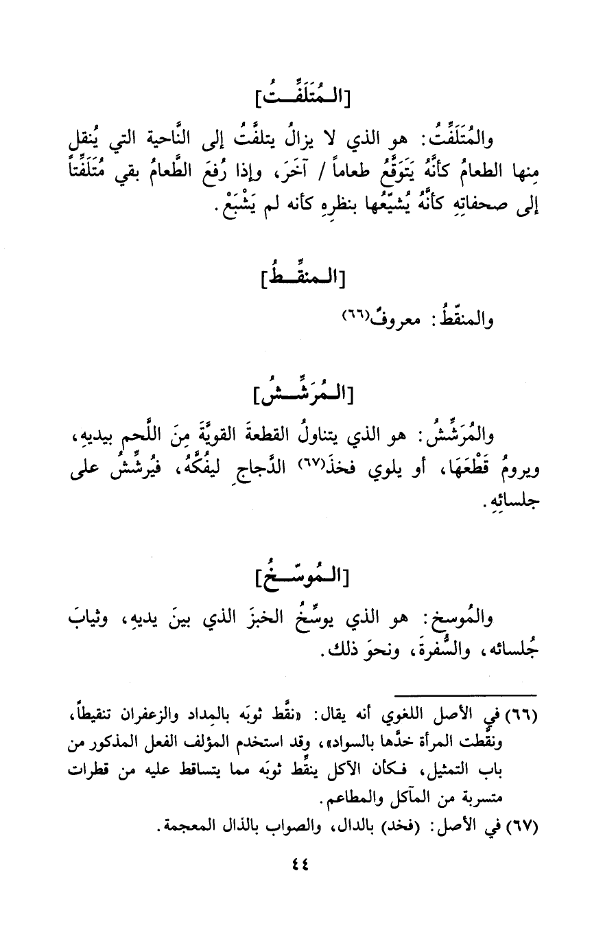 والمتلفت: هو الذي لا يزال يتلفت إلى الناحية التي ينقل منها الطعام كأنه يتوقع طعاماً آخر، وإذا رفع الطعام بقي متلفتاً إلى صحفاته كأنه يشيعها بنظره كأنه لم يشبع.