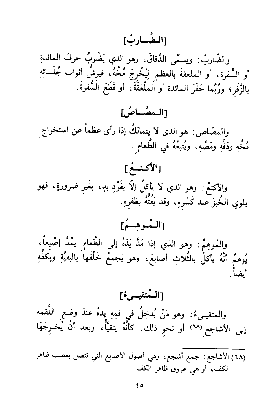 والأكتع: وهو الذي لا يأكل إلا بفرد يد، بغير ضرورة، فهو يلوي الخبز عند كسره، وقد يفته بظفره.