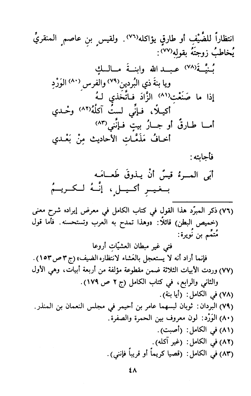 انتظاراً للضيف أو طارق يؤاكله. ولقيس بن عاصم المنقري يخاطب زوجته بقوله: