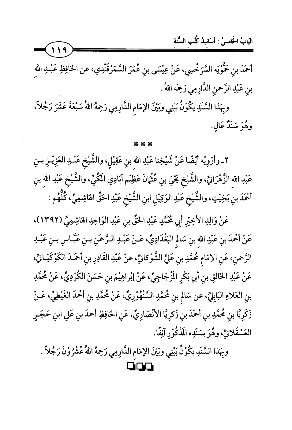 وبِهَذا السَّنَدِ يكُوْنُ بَيْنِي وبَيْنَ الإمَامِ الدَّارِمِي رَحِمهُ اللهُ عُشْرُوْنَ رَجُلاً.