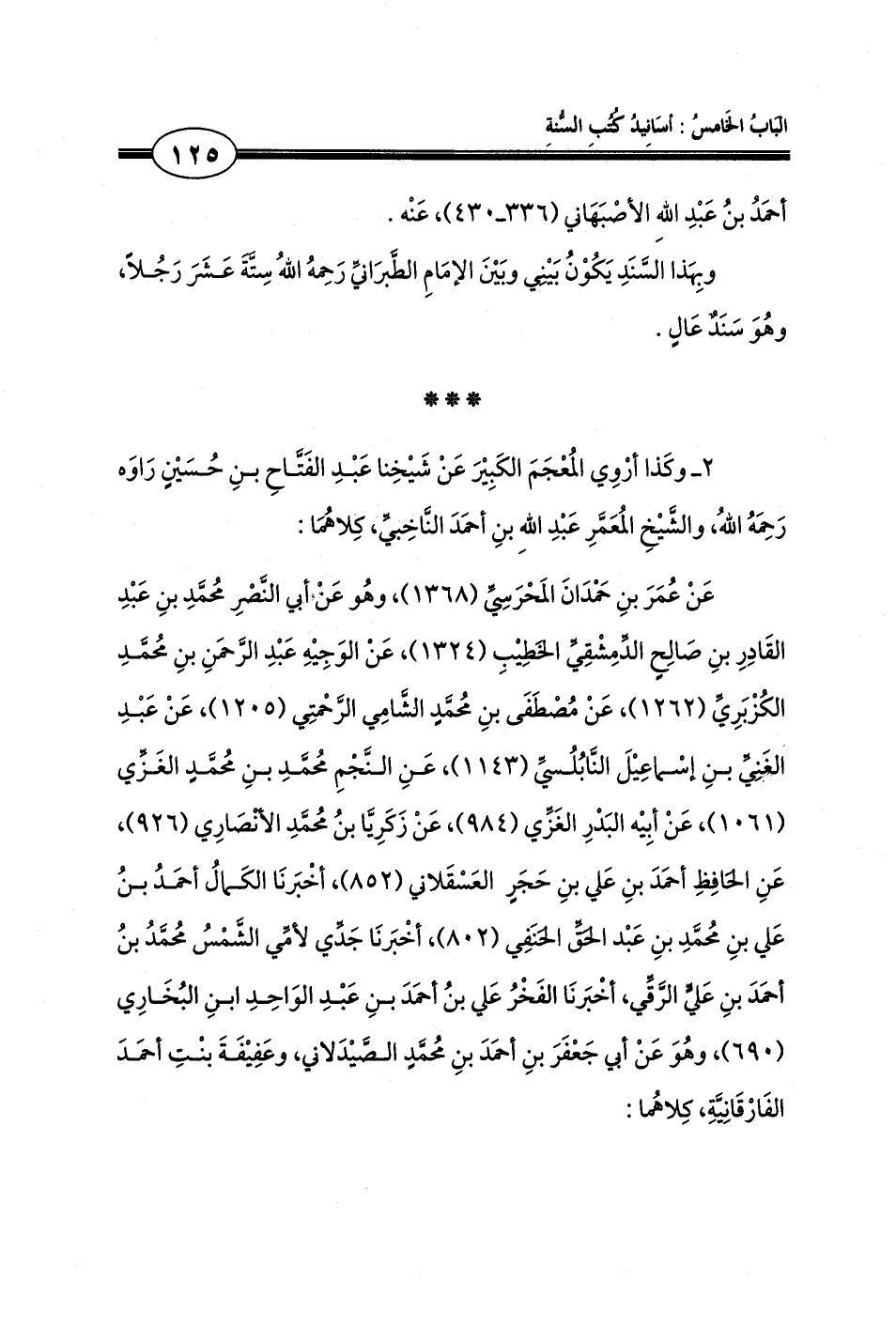عَنْ عُمَرَ بنِ حَمْدَانَ المَحْرَسِيِّ (1368)، وهُو عَنْ أبي النَّصْرِ مُحمَّدِ بنِ عَبْدِ القَادِرِ بنِ صَالِحٍ الدِّمِشْقِيِّ الخَطِيْبِ (1324)، عَنْ الوَجِيْهِ عَبْدِ الرَّحمَنِ بنِ مُحمَّدِ الكُزْبَرِيِّ (1262)، عَنْ مُصْطَفَى بنِ مُحمَّدٍ الشَّامِي الرَّحْمتِي (1205)، عَنْ عَبْدِ الغَنِيِّ بنِ إسْماعِيْلَ النَّابُلُسيِّ (1143)، عَنِ النَّجْمِ مُحمَّدِ بنِ مُحمَّدٍ الغَزِّي (1061)، عَنْ أبِيْه البَدْرِ الغَزِّي (984)، عَنْ زَكَرِيَّا بنُ مُحمَّدِ الأنْصَارِي (926)، عَنِ الحَافِظِ أحمَدَ بنِ عَلي بنِ حَجَرٍ العَسْقَلاني (852)، أخْبَرنَا الكَمالُ أحمَدُ بنُ عَلي بنِ مُحمَّدِ بنِ عَبْد الحَقِّ الحَنَفِي (802)، أخْبَرنَا جَدِّي لأمِّي الشَّمْسُ مُحمَّدُ بنُ أحمَدَ بنِ عَليٍّ الرَّقِّي، أخْبَرنَا الفَخْرُ عَلي بنُ أحمَدَ بنِ عَبْدِ الوَاحِدِ ابنِ البُخَارِي (690)، وهُوَ عَنْ أبي جَعْفَرَ بنِ أحمَدَ بنِ مُحمَّدٍ الصَّيْدَلاني، وعَفِيْفَةَ بنْتِ أحمَدَ الفَارْقَانِيَّةِ، كِلاهُما: