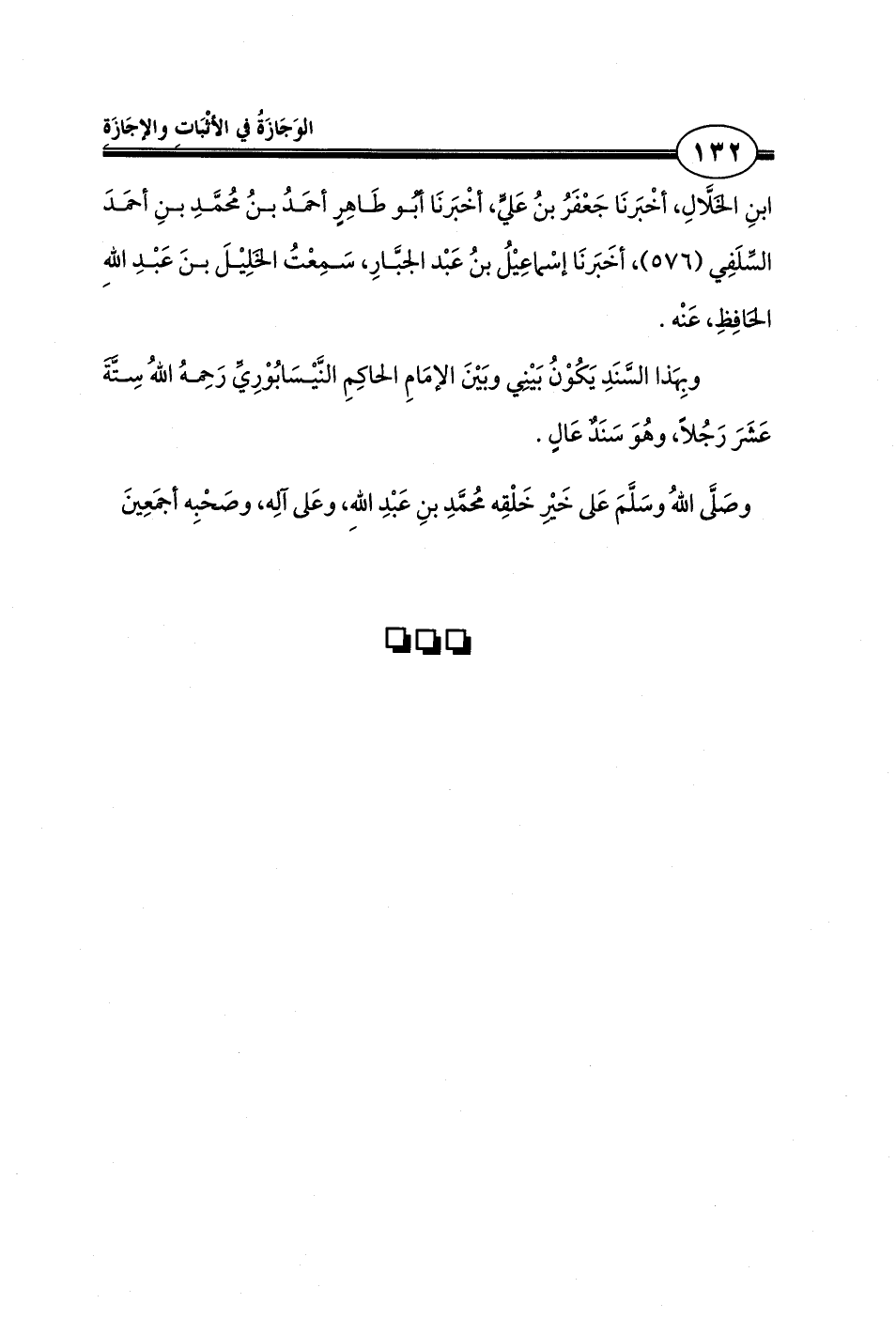 وبِهَذا السَّنَدِ يَكُوْنُ بَيْنِي وبَيْنَ الإمَامِ الحاكِمِ النَّيْسَابُوْرِيِّ رَحِمهُ اللهُ سِتَّةَ عَشَرَ رَجُلاً، وهُوَ سَنَدٌ عَالٍ.