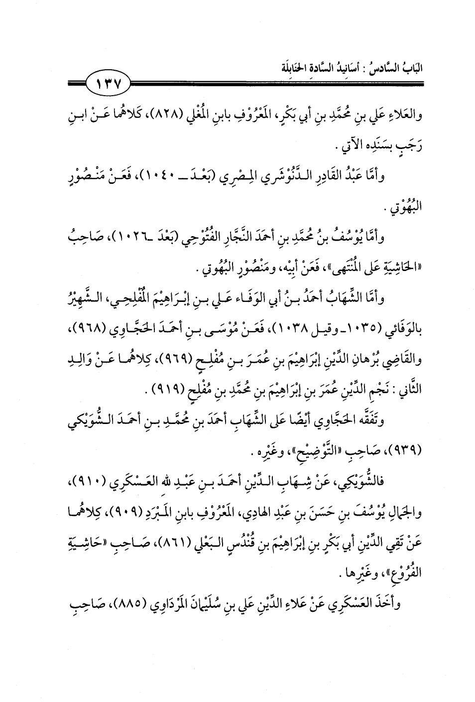 وأمَّا يُوْسُفُ بنُ مُحمَّدِ بنِ أحمَدَ النَّجَّارِ الفُتُوْحِي (بَعْدَ ـ 1026)، صَاحِبُ «الحَاشِيَةِ عَلى المُنْتَهى»، فَعَنْ أبِيْه، ومَنْصُوْرٍ البُهُوتي.