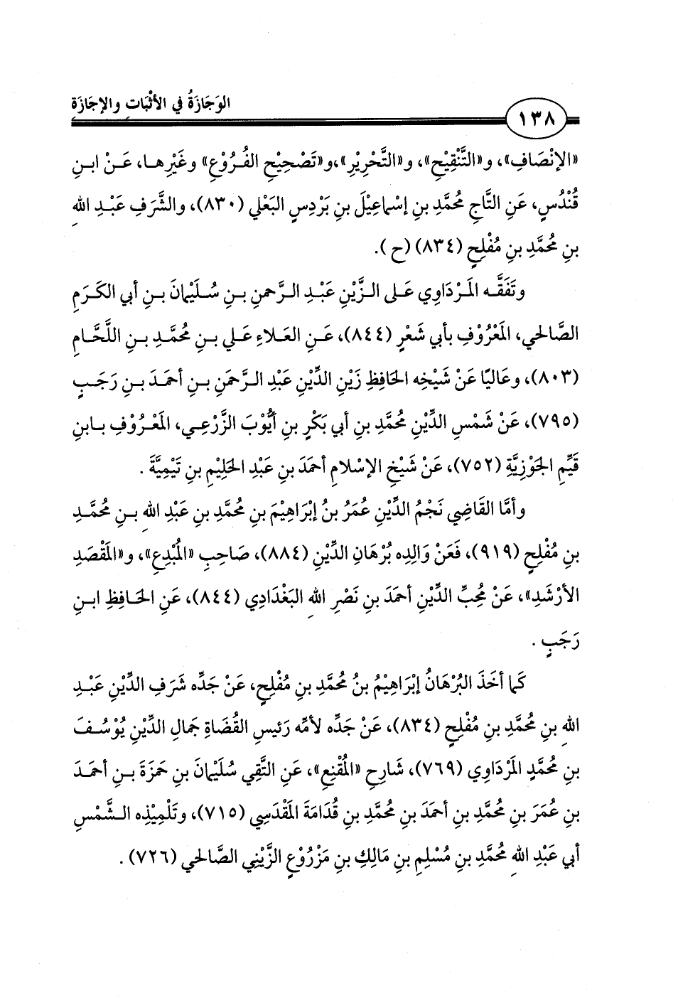«الإنْصَافِ»، و «التَّنْقِيْحِ»، و «التَّحْرِيْرِ»،و «تَصْحِيْحِ الفُرُوْعِ» وغَيْرِها، عَنْ ابنِ قُنْدُسٍ، عَنِ التَّاجِ مُحمَّدِ بنِ إسْماعِيْلَ بنِ بَرْدِسٍ البَعْلي (830)، والشَّرَفِ عَبْدِ اللهِ بنِ مُحمَّدِ بنِ مُفْلِحٍ (834) (ح).