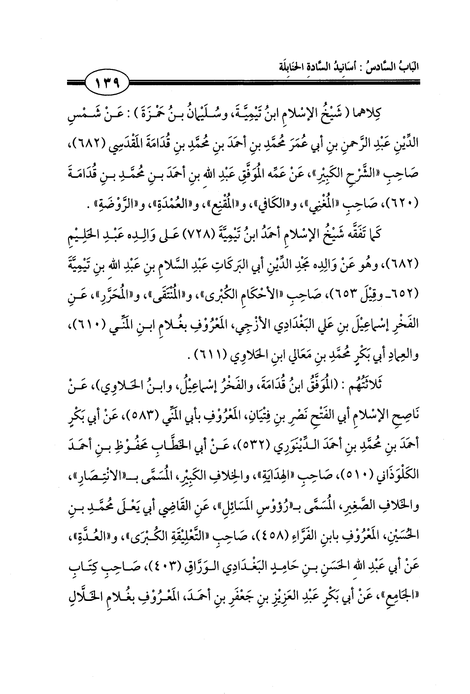 كَما تَفَقَّه شَيْخُ الإسْلامِ أحمَدُ ابنُ تَيْمِيَّةَ (728) عَلى وَالِدِه عَبْدِ الحَلِيْمِ (682)، وهُو عَنْ وَالِدِه مَجْدِ الدِّيْنِ أبي البَركَاتِ عَبْدِ السَّلامِ بنِ عَبْدِ اللهِ بنِ تَيْمِيَّةَ (652 ـ وقِيْلَ 653)، صَاحِبِ «الأحْكَامِ الكُبْرى»، و «المُنْتَقَى»، و «المُحَرَّرِ»، عَنِ الفَخْرِ إسْماعِيْلَ بنِ عَلي البَغْدَادِي الأزْجِي، المَعْرُوْفِ بغُلامِ ابنِ المَنِّي (610)، والعِمادِ أبي بَكْرٍ مُحمَّدِ بنِ مَعَالي ابنِ الحَلاوِي (611).