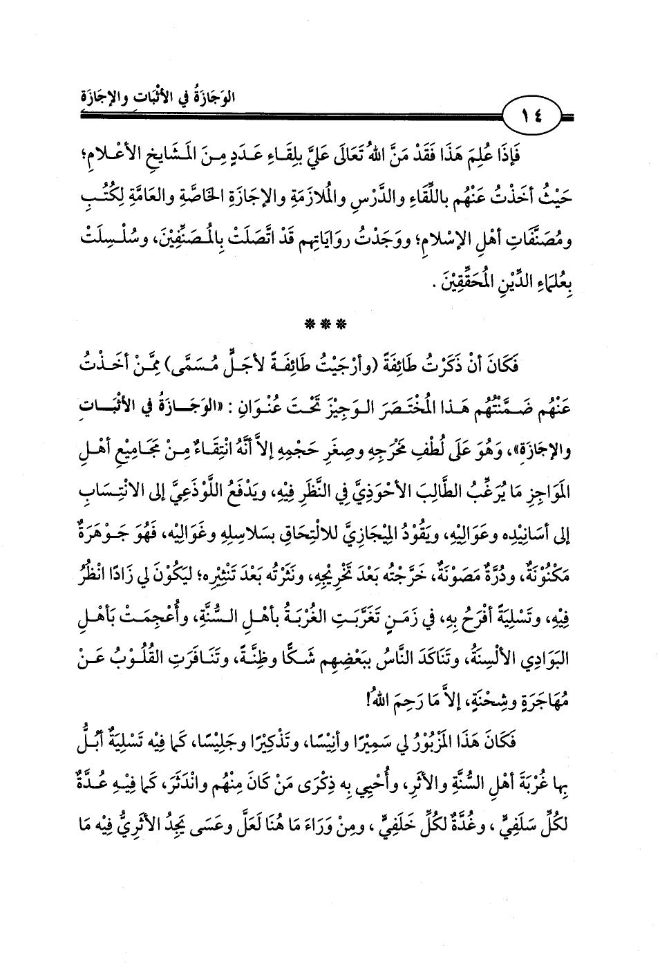 فَكَانَ أنْ ذَكَرْتُ طَائِفَةً (وأرْجَيْتُ طَائِفَةً لأجَلٍّ مُسَمَّى) مِمَّنْ أخَذْتُ عَنْهُم ضَمَّنْتُهُم هَذا المُخْتَصَرَ الوَجِيْزَ تَحْتَ عُنْوَانِ: «الوَجَازَةُ في الأثْبَاتِ والإجَازَةِ»، وَهُوَ عَلَى لُطْفِ مَخْرَجِهِ وصِغَرِ حَجْمِهِ إلاَّ أنَّهُ انْتِقَاءٌ مِنْ مَجَامِيْعِ أهْلِ المَوَاجِزِ مَا يُرَغِّبُ الطَّالِبَ الأحْوَذِيَّ فِي النَّظَرِ فِيْهِ، ويَدْفَعُ اللَّوْذَعِيَّ إلى الانْتِسَابِ إلى أسَانِيْدِه وعَوَالِيْهِ، ويَقُوْدُ المِيْجَازِيَّ للالْتِحَاقِ بسَلاسِلِهِ وغَوَالِيْه، فَهُوَ جَوْهَرَةٌ مَكْنُوْنَةٌ، ودُرَّةٌ مَصَوْنَةٌ، خَرَّجْتُه بَعْدَ تَخْرِيْجِهِ، ونَثَرْتُه بَعْدَ تَنْثِيْرِه؛ ليَكُوْنَ لي زَادًا انْظُرُ فِيْهِ، وتَسْلِيَةً أفْرَحُ بِهِ، في زَمَنٍ تَغَرَّبَتِ الغُرْبَةُ بأهْلِ السُّنَّةِ، وأُعْجِمَتْ بَأهْلِ البَوَادِي الألْسِنَةُ، وتَنَاكَدَ النَّاسُ ببَعْضِهِم شَكًّا وظِنَّةً، وتَنَافَرَتِ القُلُوْبُ عَنْ مُهَاجَرَةٍ وشِحْنَةٍ، إلاَّ مَا رَحِمَ اللهُ!
