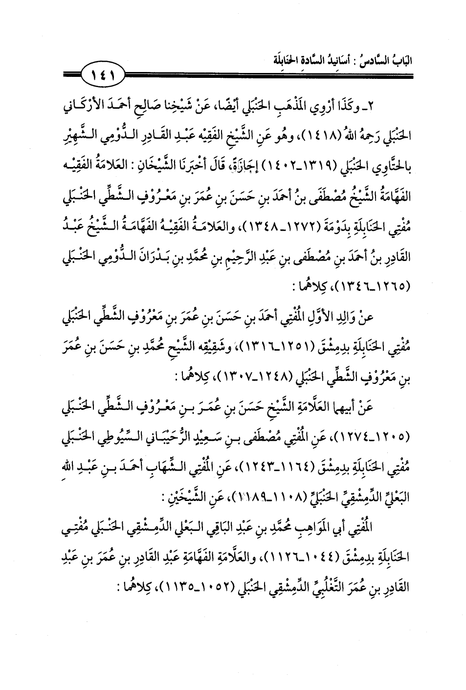 2 ـ وكَذَا أرْوِي المَذْهَبِ الحَنْبَلي أيْضًا، عَنْ شَيْخِنا صَالِحِ أحمَدَ الأرْكَاني الحَنْبَلي رَحِمهُ اللهُ (1418)، وهُو عَنِ الشَّيْخِ الفَقِيْه عَبْدِ القَادِرِ الدُّوْمِي الشَّهِيْرِ بالحتَّاوِي الحَنْبَلي (1319 ـ 1402) إجَازَةً، قَالَ أخْبَرنَا الشَّيْخَانِ: العَلامَةُ الفَقِيْه الفَهَّامَةُ الشَّيْخُ مُصْطَفَى بنُ أحمَدَ بنِ حَسَنَ بنِ عُمَرَ بنِ مَعْرُوْفٍ الشَّطِّي الحَنْبَلي مُفْتِي الحَنَابِلَةِ بِدَوْمَةَ (1272 ـ 1348)، والعَلامَةُ الفَقِيْهُ الفَهَّامَةُ الشَّيْخُ عَبْدُ القَادِرِ بنُ أحمَدَ بنِ مُصْطَفى بنِ عَبْدِ الرَّحِيْمِ بنِ مُحمَّدِ بنِ بَدْرَانَ الدُّوْمِي الحَنْبَلي (1265 ـ 1346)، كِلاهُما: