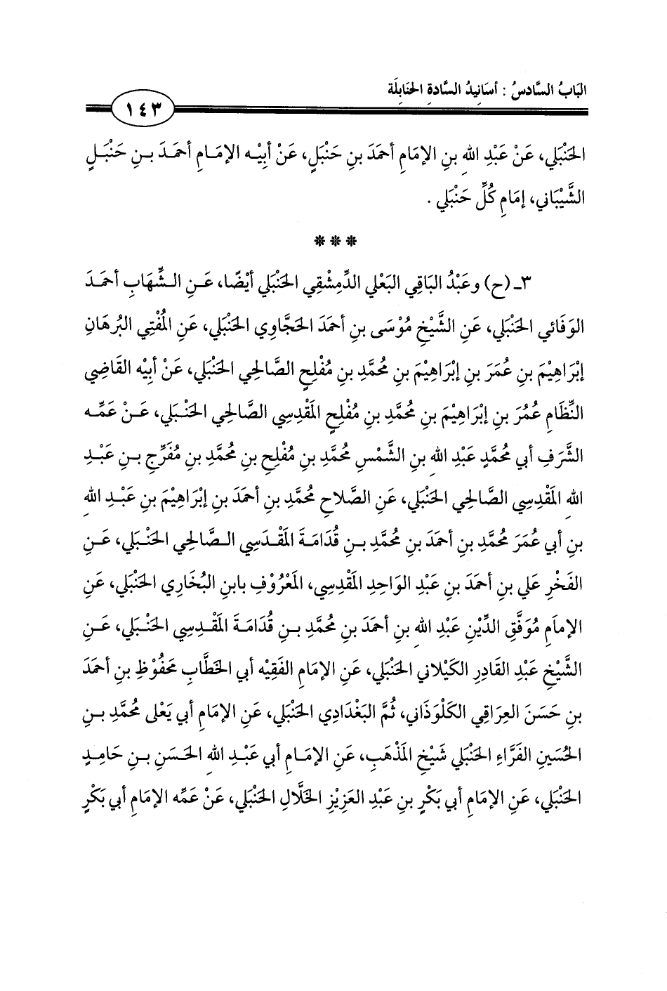 3 ـ (ح) وعَبْدُ البَاقِي البَعْلي الدِّمِشْقِي الحَنْبَلي أيْضًا، عَنِ الشِّهَابِ أحمَدَ الوَفَائي الحَنْبَلي، عَنِ الشَّيْخِ مُوْسَى بنِ أحمَدَ الحَجَّاوِي الحَنْبَلي، عَنِ المُفْتِي البُرهَانِ إبْرَاهِيْمَ بنِ عُمَرَ بنِ إبْرَاهِيْمَ بنِ مُحمَّدِ بنِ مُفْلِحٍ الصَّالحِي الحَنْبَلي، عَنْ أبِيْه القَاضِي النِّظَامِ عُمُرَ بنِ إبْرَاهِيْمَ بنِ مُحمَّدِ بنِ مُفْلِحٍ المَقْدِسِي الصَّالحِي الحَنْبَلي، عَنْ عَمِّه الشَّرَفِ أبي مُحمَّدٍ عَبْدِ اللهِ بنِ الشَّمْسِ مُحمَّدِ بنِ مُفْلِحِ بنِ مُحمَّدِ بنِ مُفَرِّجِ بنِ عَبْدِ اللهِ المَقْدِسِي الصَّالحِي الحَنْبَلي، عَنِ الصَّلاحِ مُحمَّدِ بنِ أحمَدَ بنِ إبْرَاهِيْمَ بنِ عَبْدِ اللهِ بنِ أبي عُمَرَ مُحمَّدِ بنِ أحمَدَ بنِ مُحمَّدِ بنِ قُدَامَةَ المَقْدَسِي الصَّالحِي الحَنْبَلي، عَنِ الفَخْرِ عَلي بنِ أحمَدَ بنِ عَبْدِ الوَاحِدِ المَقْدِسِي، المَعْرُوْفِ بابنِ البُخَارِي الحَنْبَلي، عَنِ الإماَمِ مُوَفَّقِ الدِّيْنِ عَبْدِ اللهِ بنِ أحمَدَ بنِ مُحمَّدِ بنِ قُدَامَةَ المَقْدِسِي الحَنْبَلي، عَنِ الشَّيْخِ عَبْدِ القَادِرِ الكَيْلاني الحَنْبَلي، عَنِ الإمَامِ الفَقِيْه أبي الخَطَّابِ مَحفُوْظِ بنِ أحمَدَ بنِ حَسَنَ العِرَاقِي الكَلْوَذَاني، ثُمَّ البَغْدَادِي الحَنْبَلي، عَنِ الإمَامِ أبي يَعْلى مُحمَّدِ بنِ الحُسَينِ الفَرَّاءِ الحَنْبَلي شَيْخِ المَذْهَبِ، عَنِ الإمَامِ أبي عَبْدِ اللهِ الحَسَنِ بنِ حَامِدٍ الحَنْبَلي، عَنِ الإمَامِ أبي بَكْرٍ بنِ عَبْدِ العَزِيْزِ الخَلَّالِ الحَنْبَلي، عَنْ عَمِّه الإمَامِ أبي بَكْرٍ