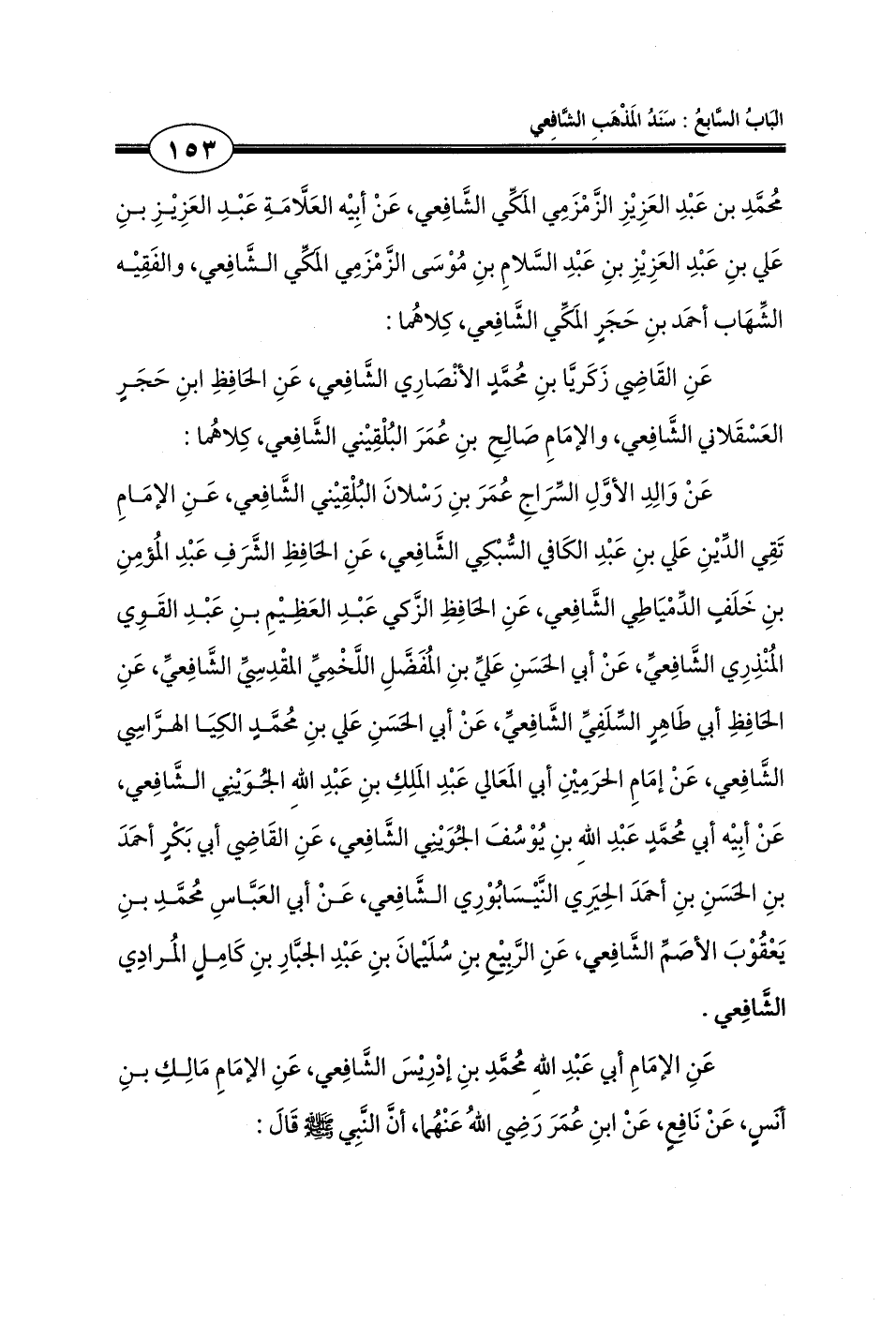 عَنْ وَالِدِ الأوَّلِ السِّرَاجِ عُمَرَ بنِ رَسْلانَ البُلْقِيْني الشَّافِعي، عَنِ الإمَامِ تَقِي الدِّيْنِ عَلي بنِ عَبْدِ الكَافي السُّبْكِي الشَّافِعي، عَنِ الحَافِظِ الشَّرَفِ عَبْدِ المُؤمِنِ بنِ خَلَفٍ الدِّمْيَاطِي الشَّافِعي، عَنِ الحَافِظِ الزَّكي عَبْدِ العَظِيْمِ بنِ عَبْدِ القَوِي المُنْذِرِي الشَّافِعيِّ، عَنْ أبي الحَسَنِ عَليِّ بنِ المُفَضَّلِ اللَّخْمِيِّ المقْدِسِيِّ الشَّافِعيِّ، عَنِ الحَافِظِ أبي طَاهِرٍ السِّلَفِيِّ الشَّافِعيِّ، عَنْ أبي الحَسَنِ عَلي بنِ مُحمَّدٍ الكِيَا الهرَّاسِي الشَّافِعي، عَنْ إمَامِ الحرَمِيْنِ أبي المَعَالي عَبْدِ المَلِكِ بنِ عَبْدِ اللهِ الجُوَيْنِي الشَّافِعي، عَنْ أبِيْه أبي مُحمَّدٍ عَبْدِ اللهِ بنِ يُوْسُفَ الجُوَيْنِي الشَّافِعي، عَنِ القَاضِي أبي بَكْرٍ أحمَدَ بنِ الحَسَنِ بنِ أحمَدَ الحِيَرِي النَّيْسَابُوْرِي الشَّافِعي، عَنْ أبي العَبَّاسِ مُحمَّدِ بنِ يَعْقُوْبَ الأصَمِّ الشَّافِعي، عَنِ الرَّبِيْعِ بنِ سُلَيْمانَ بنِ عَبْدِ الجبَّارِ بنِ كَامِلٍ المُرادِي الشَّافِعي، عَنِ الإمَامِ أبي عَبْدِ اللهِ مُحمَّدِ بنِ إدْرِيْسَ الشَّافِعي، عَنِ الإمَامِ مَالِكِ بنِ أنَسٍ، عَنْ نَافِعٍ، عَنْ ابنِ عُمَرَ رَضِي اللهُ عَنْهُما، أنَّ النَّبِي - صلى الله عليه وسلم - قَالَ: