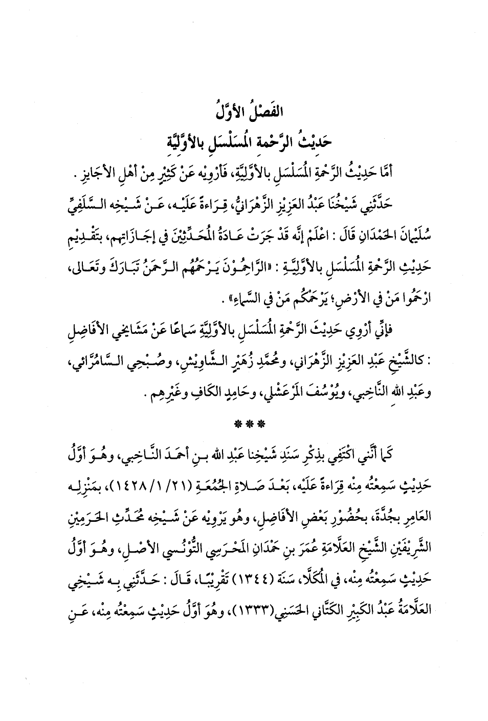 فإنِّي أرْوِي حَدِيْثَ الرَّحْمةِ المُسَلْسَلِ بالأوَّلِيَّةِ سَماعًا عَنْ مَشَايخي الأفَاضِلِ: كالشَّيْخِ عَبْدِ العَزِيْزِ الزَّهْرَاني، ومُحمَّدِ زُهَيْرٍ الشَّاوِيْشِ، وصُبْحِي السَّامُرَّائي، وعَبْدِ اللهِ النَّاخِبي، ويُوْسُفَ المَرْعَشْلي، وحَامِدٍ الكَافِ وغَيْرِهِم.