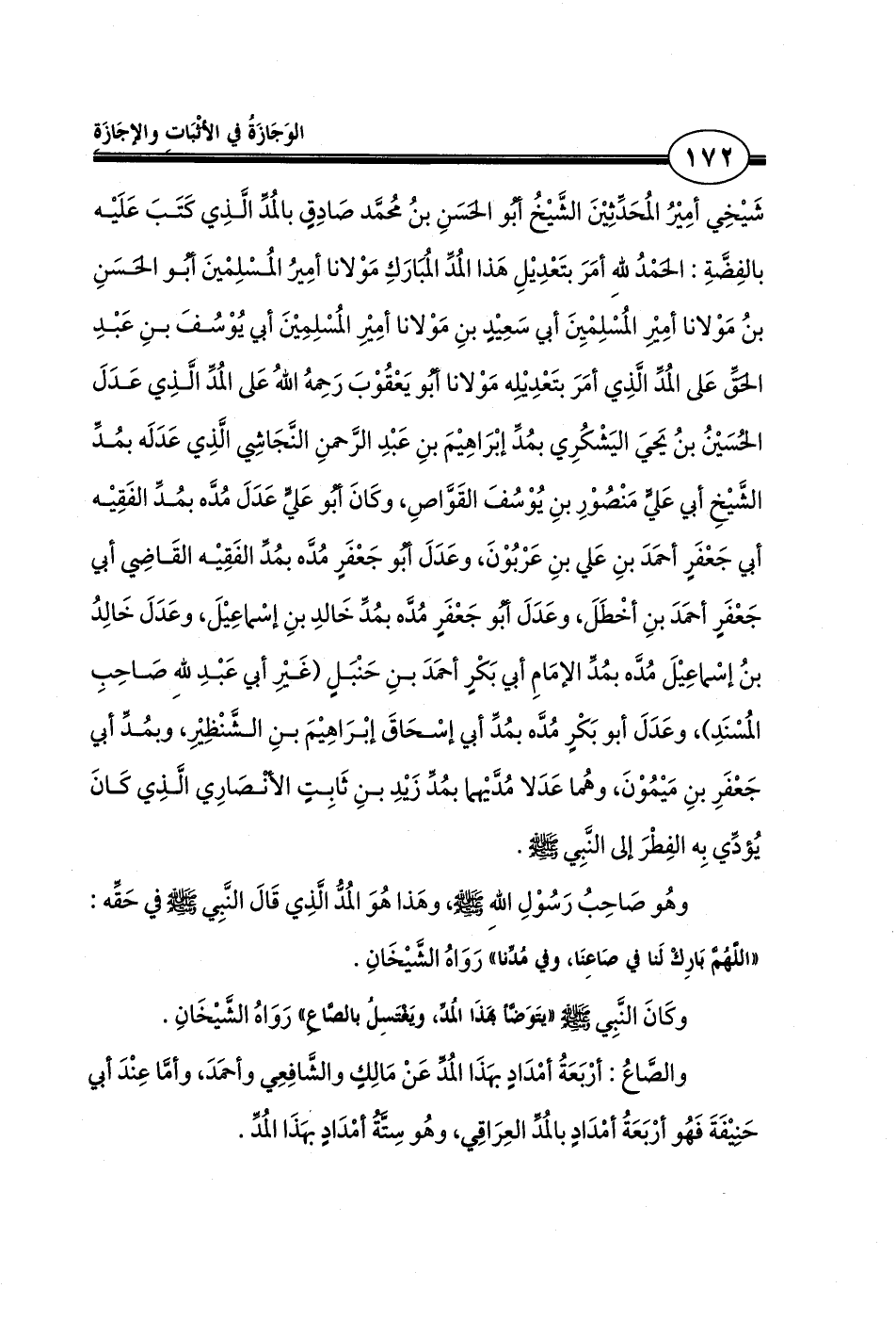 شَيْخِي أمِيْرُ المُحَدِّثِيْنَ الشَّيْخُ أبُو الحَسَنِ بنُ مُحمَّد صَادِقٍ بالمُدِّ الَّذِي كَتَبَ عَلَيْه بالفِضَّةِ: الحَمْدُ للهِ أمَرَ بتَعْدِيْلِ هَذا المُدِّ المُبَارَكِ مَوْلانا أمِيرُ المُسْلِمْينَ أبُو الحَسَنِ بنُ مَوْلانا أمِيْرِ المُسْلِمْيِنَ أبي سَعِيْدٍ بنِ مَوْلانا أمِيْرِ المُسْلِمِيْنَ أبي يُوْسُفَ بنِ عَبْدِ الحَقِّ عَلى المُدِّ الَّذِي أمَرَ بتَعْدِيْلِه مَوْلانا أبُو يَعْقُوْبَ رَحِمهُ اللهُ عَلى المُدِّ الَّذِي عَدَلَ الحُسَيْنُ بنُ يَحيَ اليَشْكُرِي بمُدِّ إبْرَاهِيْمَ بنِ عَبْدِ الرَّحمنِ النَّجَاشِي الَّذِي عَدَلَه بمُدِّ الشَّيْخِ أبي عَليٍّ مَنْصُوْرِ بنِ يُوْسُفَ القَوَّاصِ، وكَانَ أبُو عَليٍّ عَدَلَ مُدَّه بمُدِّ الفَقِيْه أبي جَعْفَرٍ أحمَدَ بنِ عَلي بنِ عَرْبُوْنَ، وعَدَلَ أبُو جَعْفَرٍ مُدَّه بمُدِّ الفَقِيْه القَاضِي أبي جَعْفَرٍ أحمَدَ بنِ أخْطَلَ، وعَدَلَ أبُو جَعْفَرٍ مُدَّه بمُدِّ خَالدِ بنِ إسْماعِيْلَ، وعَدَلَ خَالِدُ بنُ إسْماعِيْلَ مُدَّه بمُدِّ الإمَامِ أبي بَكْرٍ أحمَدَ بنِ حَنْبَلٍ (غَيْرِ أبي عَبْدِ للهِ صَاحِبِ المُسْنَدِ)، وعَدَلَ أبو بَكْرٍ مُدَّه بمُدِّ أبي إسْحَاقَ إبْرَاهِيْمَ بنِ الشَّنْظِيْرِ، وبمُدِّ أبي جَعْفَرِ بنِ مَيْمُوْنَ، وهُما عَدَلا مُدَّيْهما بمُدِّ زَيْدِ بنِ ثَابِتٍ الأنْصَارِي الَّذِي كَانَ يُؤدِّي بِه الفِطْرَ إلى النَّبِي - صلى الله عليه وسلم -.
