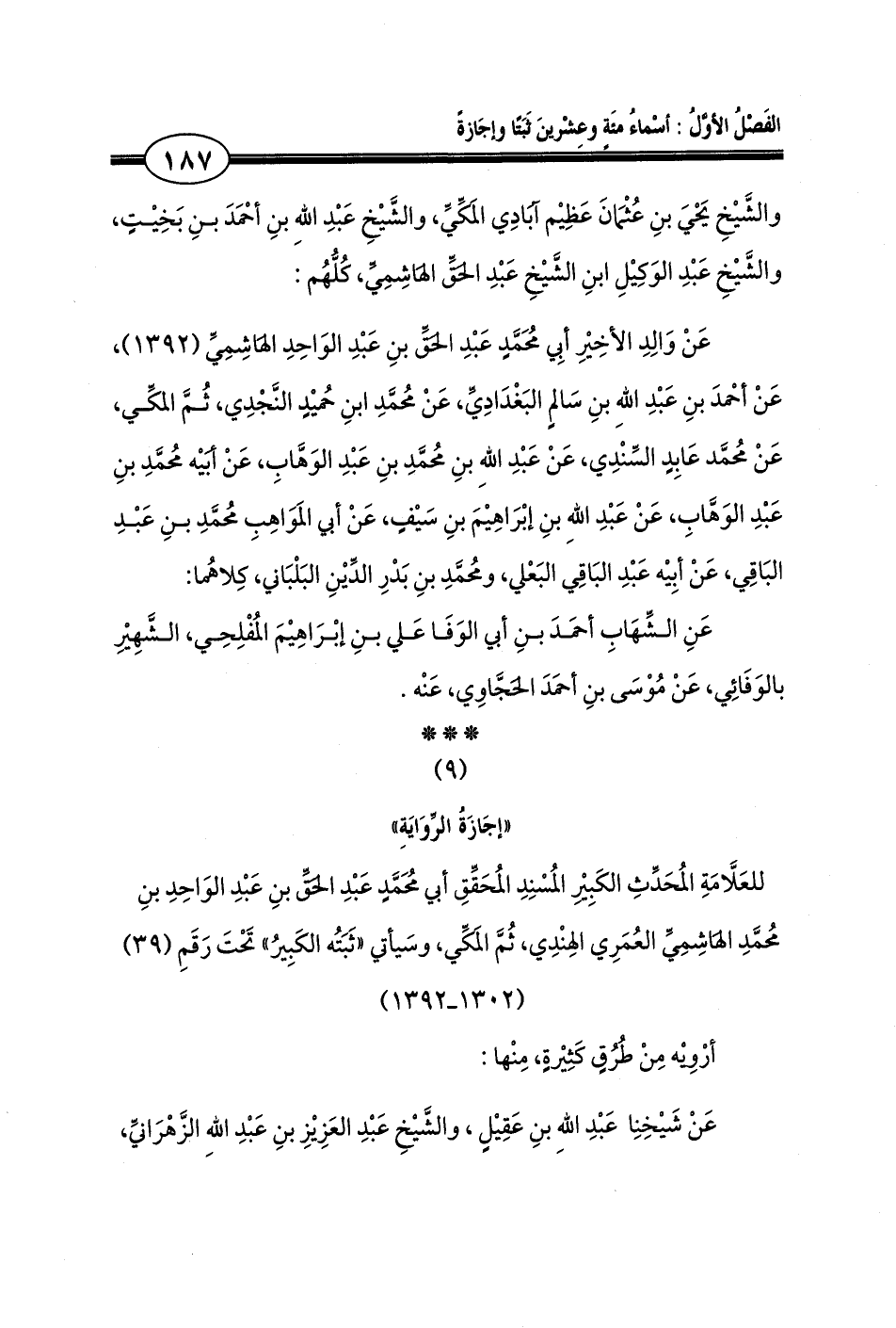 عَنْ وَالِدِ الأخِيْرِ أبِي مُحَمَّدٍ عَبْدِ الحَقِّ بنِ عَبْدِ الوَاحِدِ الهَاشِمِيِّ (1392)، عَنْ أحْمدَ بنِ عَبْدِ اللهِ بنِ سَالمٍ البَغْدَادِيِّ، عَنْ مُحمَّدِ ابنِ حُميْدٍ النَّجْدِي، ثُمَّ المكِّي، عَنْ مُحمَّد عَابِدٍ السِّنْدِي، عَنْ عَبْدِ اللهِ بنِ مُحمَّدِ بنِ عَبْدِ الوَهَّابِ، عَنْ أبَيْه مُحمَّدِ بنِ عَبْدِ الوَهَّابِ، عَنْ عَبْدِ اللهِ بنِ إبْرَاهِيْمَ بنِ سَيْفٍ، عَنْ أبي المَوَاهِبِ مُحمَّدِ بنِ عَبْدِ البَاقِي، عَنْ أبِيْه عَبْدِ البَاقِي البَعْلي، ومُحمَّدِ بنِ بَدْرِ الدِّيْنِ البَلْبَاني، كِلاهُما: