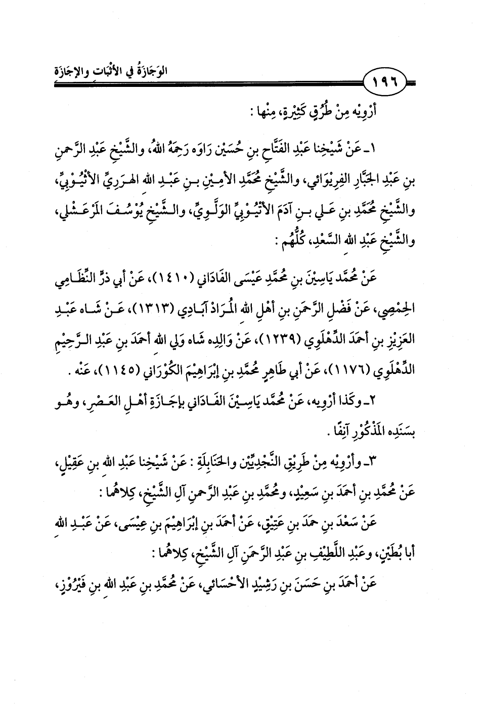 3 ـ وأرْوِيْه مِنْ طَرِيْقِ النَّجْدِيِّيْن والحَنَابِلَةِ: عَنْ شَيْخِنا عَبْدِ اللهِ بنِ عَقِيْلٍ، عَنْ مُحمَّدِ بنِ أحمَدَ بنِ سَعِيْدٍ، ومُحمَّدِ بنِ عَبْدِ الرَّحمنِ آلِ الشَّيْخِ، كِلاهُما: