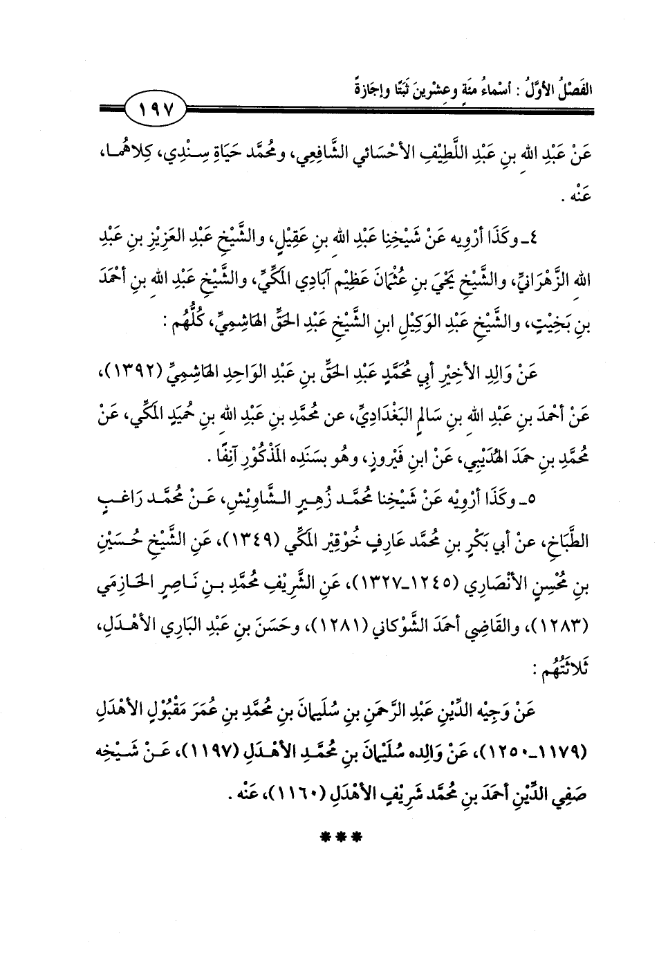 4 ـ وكَذَا أرْوِيه عَنْ شَيْخِنِا عَبْدِ اللهِ بنِ عَقِيْلٍ، والشَّيْخِ عَبْدِ العَزِيْزِ بنِ عَبْدِ اللهِ الزَّهْرَانيِّ، والشَّيْخِ يَحْيَ بنِ عُثْمَانَ عَظِيْم آبَادِي المَكِّيِّ، والشَّيْخِ عَبْدِ اللهِ بنِ أحْمَدَ بنِ بَخِيْتٍ، والشَّيْخِ عَبْدِ الوَكِيْلِ ابنِ الشَّيْخِ عَبْدِ الحَقِّ الهَاشِمِيِّ، كُلُّهُم: